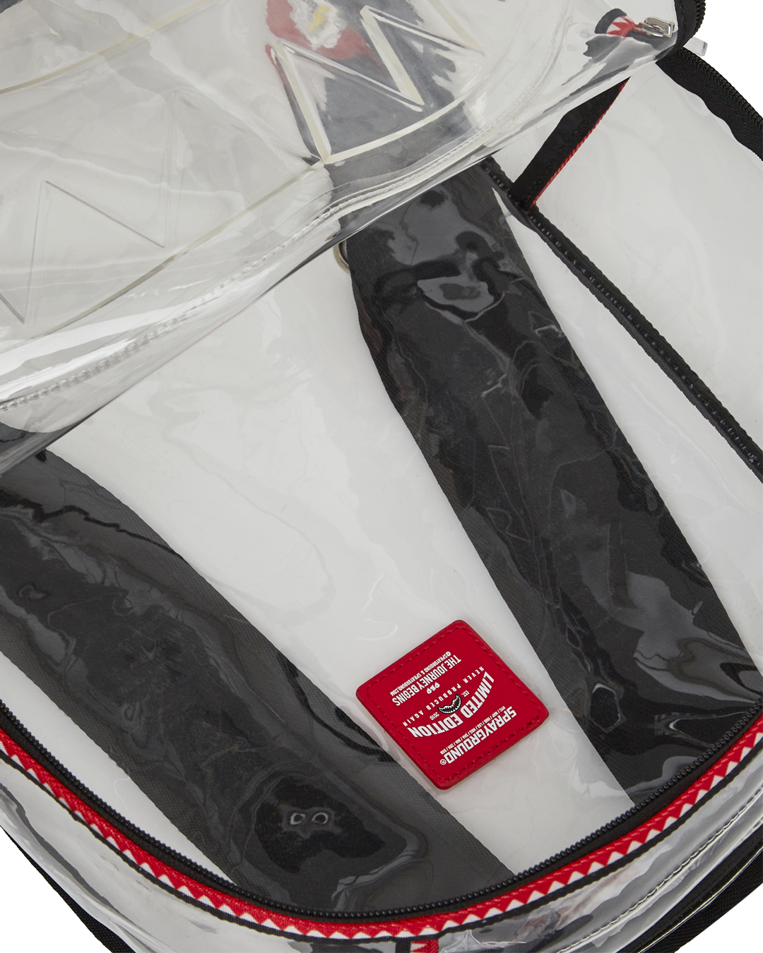 Clear PVC bag with cut and sew shark mouth with VSM patterned trims/binding