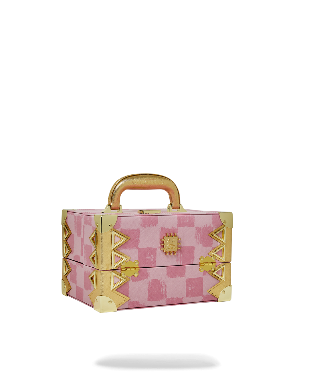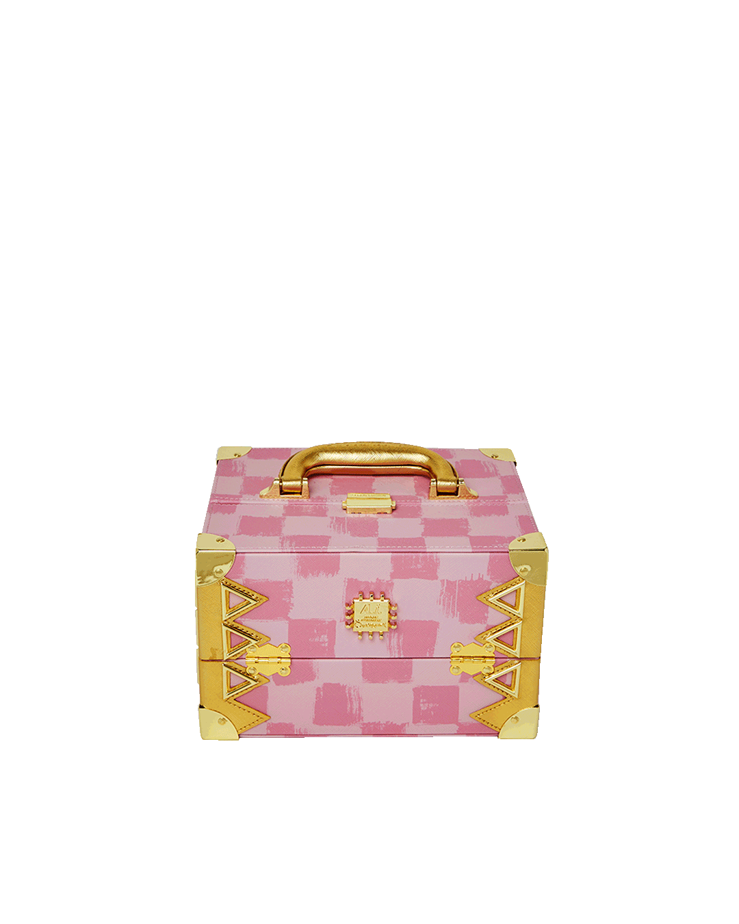 Pink velour lining, Tiered shelving, removable tray,  interior mirror.