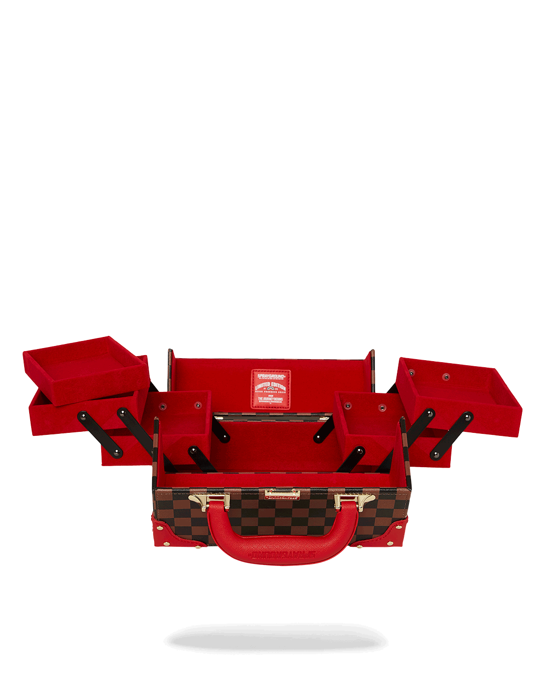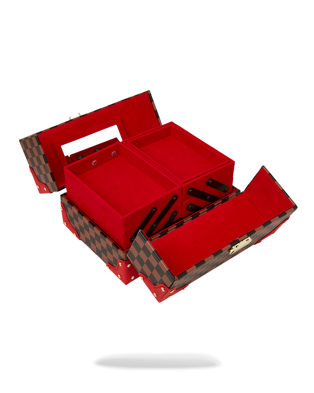 Red velour lining, Tiered shelving, removable tray, interior mirror.
