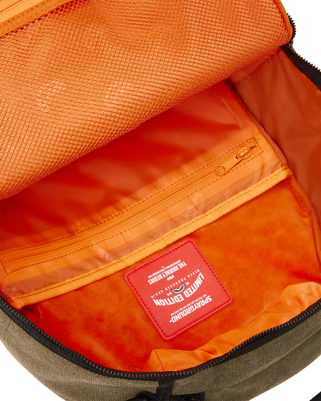 Dimensions: 18″ x 6″ x 11.5″ • Front zipper pocket • Side pockets • Zippered Stash pocket • Separate velour sunglass compartment • Ergonomic mesh back padding • Adjustable Straps for custom sizing • Green zippers with metal hardware • Metal “Sprayground Authentic” badge • Slide through back sleeve connects to carry on luggage to free your hands