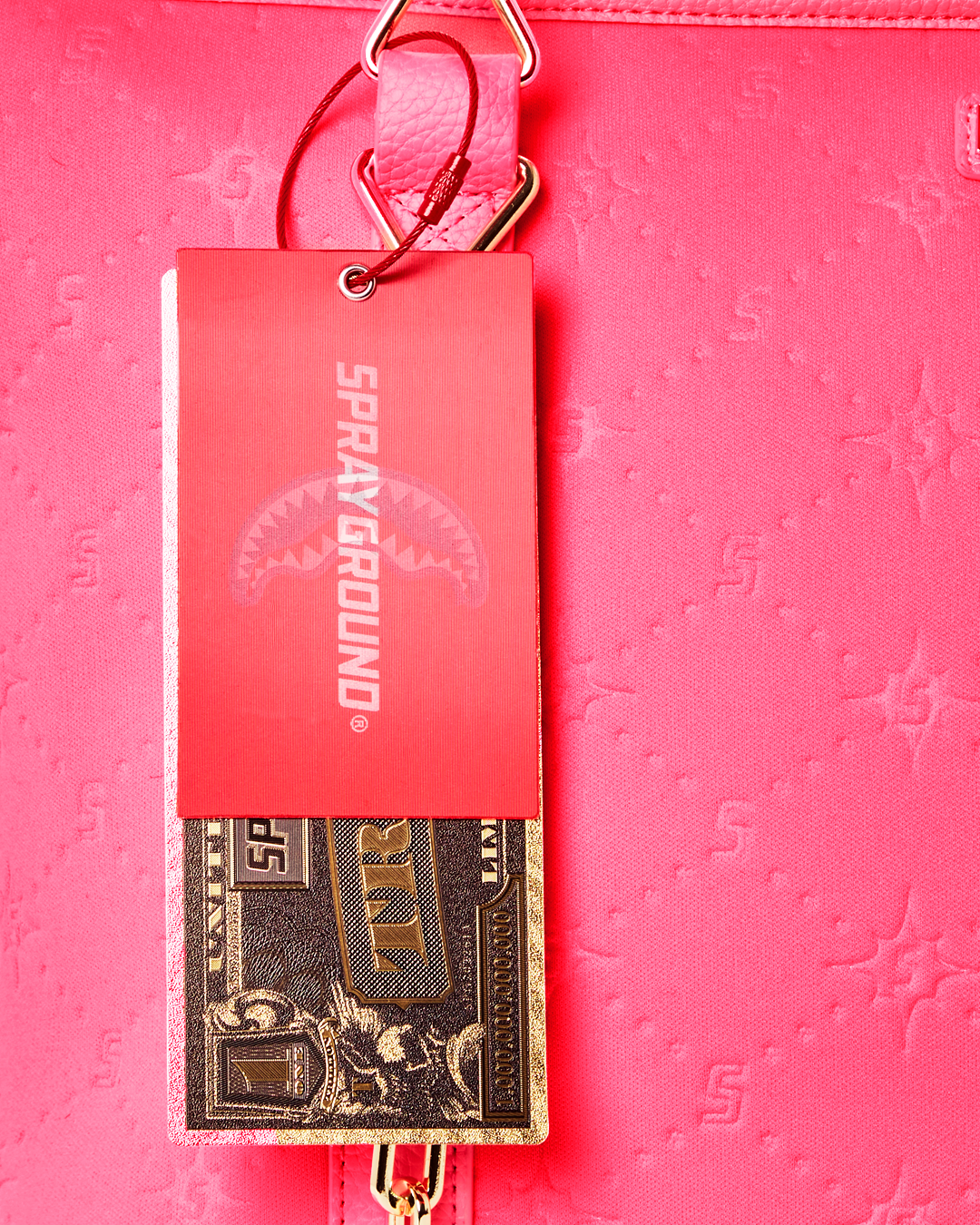 Sporty neoprene fabric embossed with custom Sprayground logo pattern.