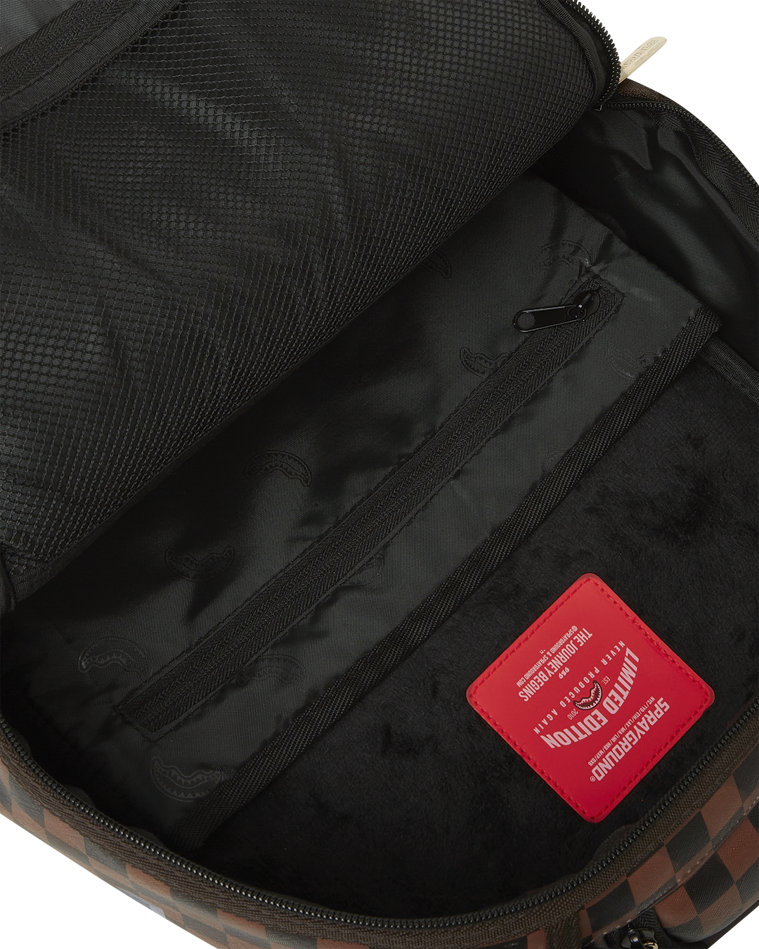 Dimensions: 18″ x 6″ x 11.5″ • Front zipper pocket • Side pockets • Zippered Stash pocket • Separate velour sunglass compartment • Ergonomic mesh back padding • Adjustable Straps for custom sizing • Gold zippers with metal hardware • Metal “Sprayground Authentic” badge • Slide through back sleeve connects to carry-on luggage to free your hands