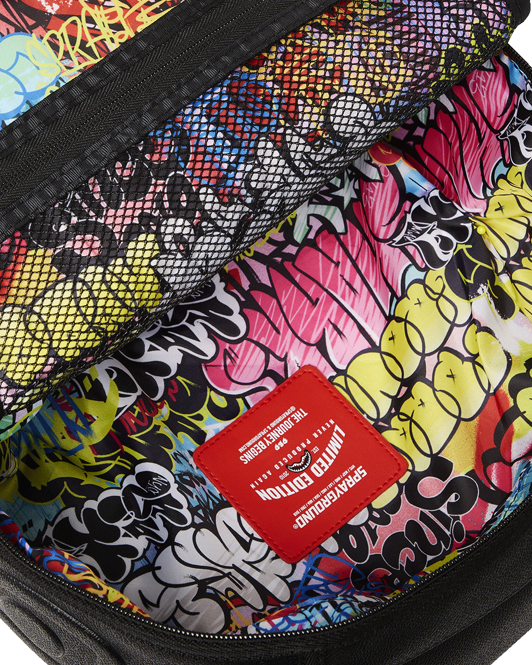 Dimensions: 18″ x 6″ x 11.5″ • Front zipper pocket • Side pockets • Zippered Stash pocket • Separate velour sunglass compartment • Ergonomic mesh back padding • Adjustable Straps for custom sizing • Gold zippers with metal hardware • Metal “Sprayground Authentic” badge • Slide through back sleeve connects to carry-on luggage to free your hands