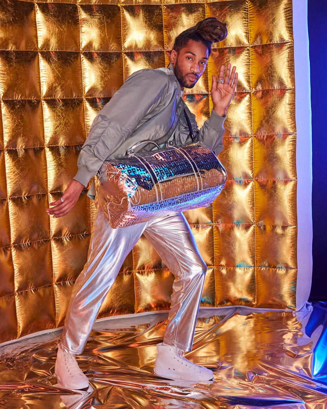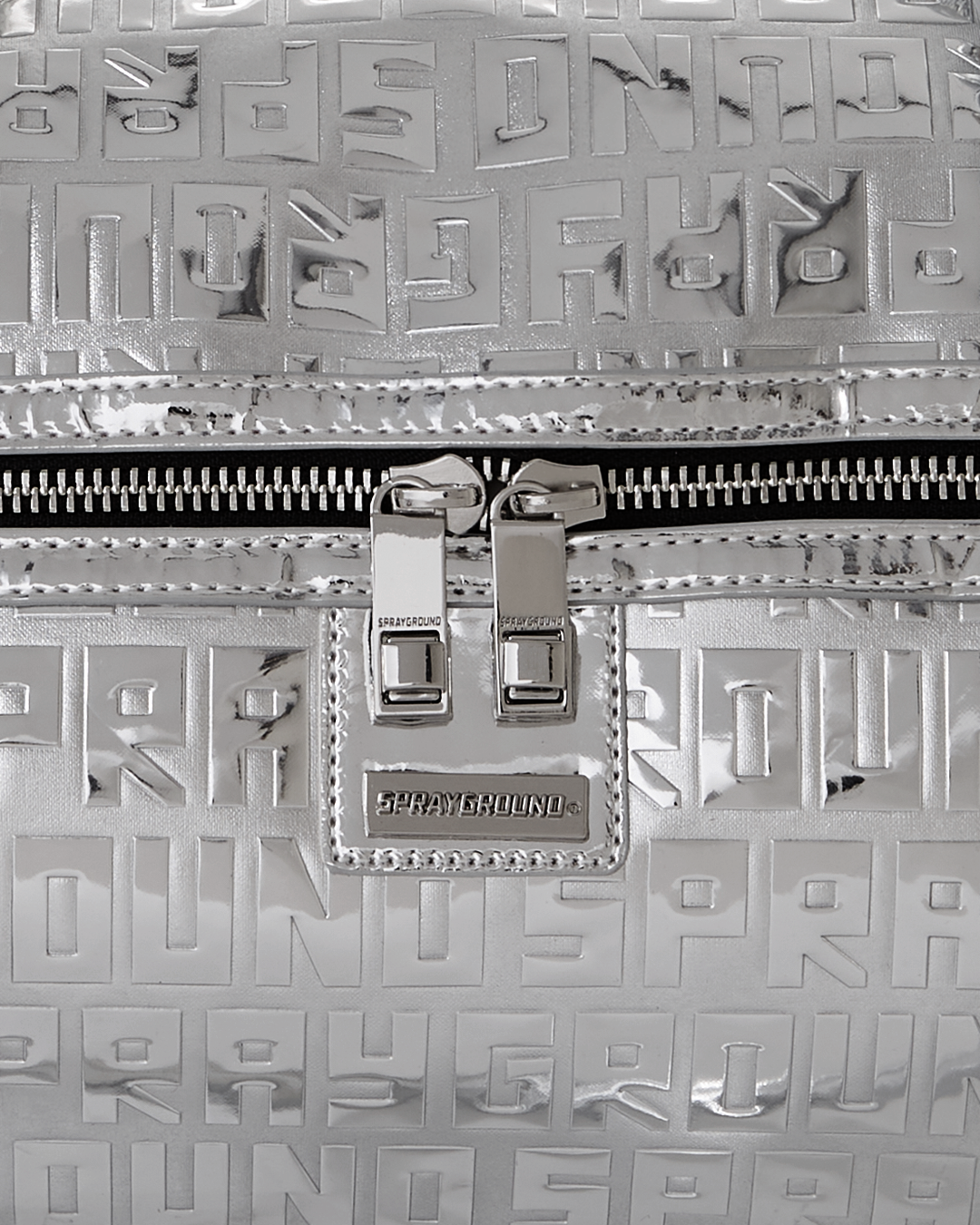 Embossed Sprayground logo on Metallic Silver PU with mirror-like shine