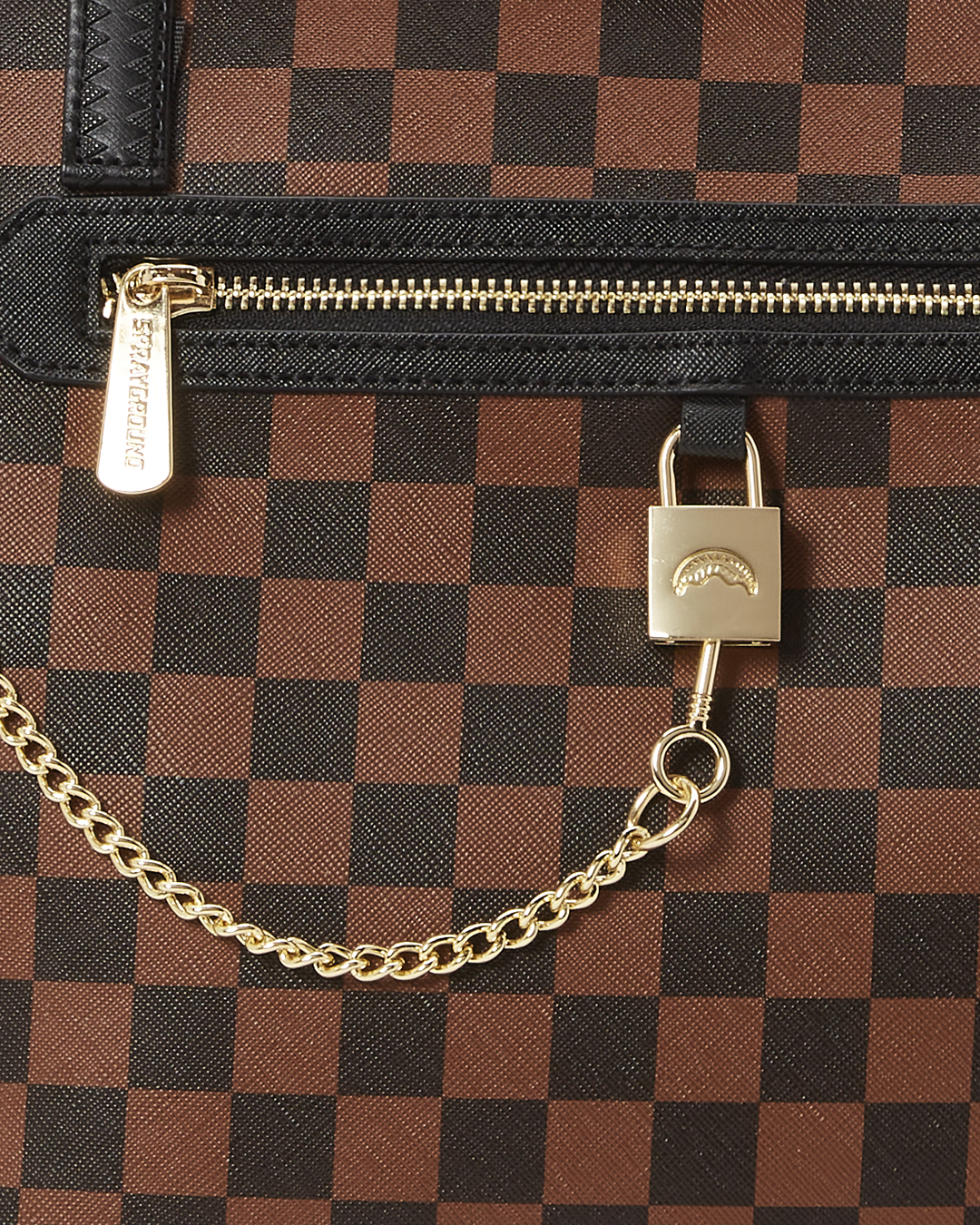 Dimensions: 19″ x 6.5″ x 11.5″ ? Top zipper opening ? Top double handle ? Sprayground keychain ? Gold zippers with metal hardware