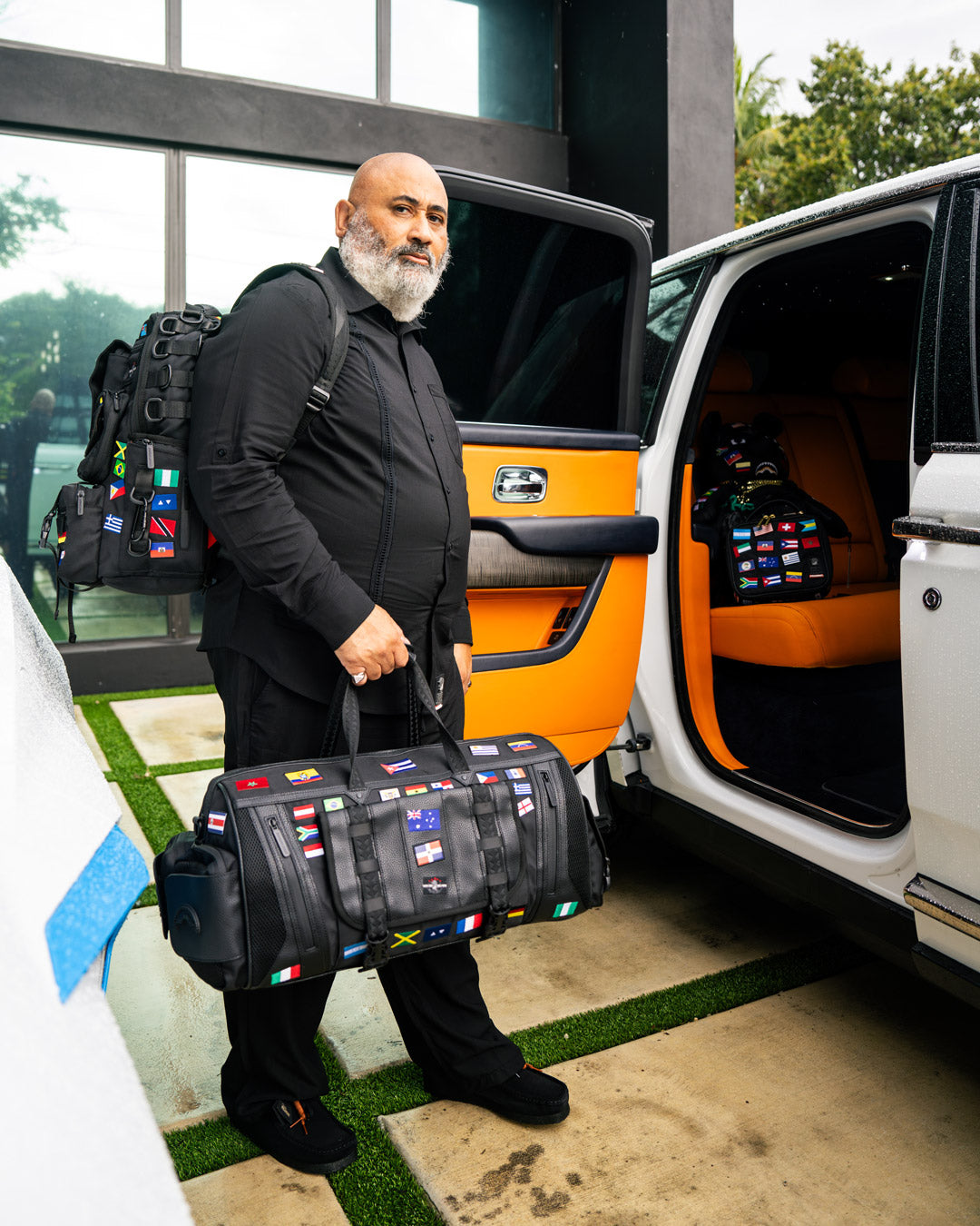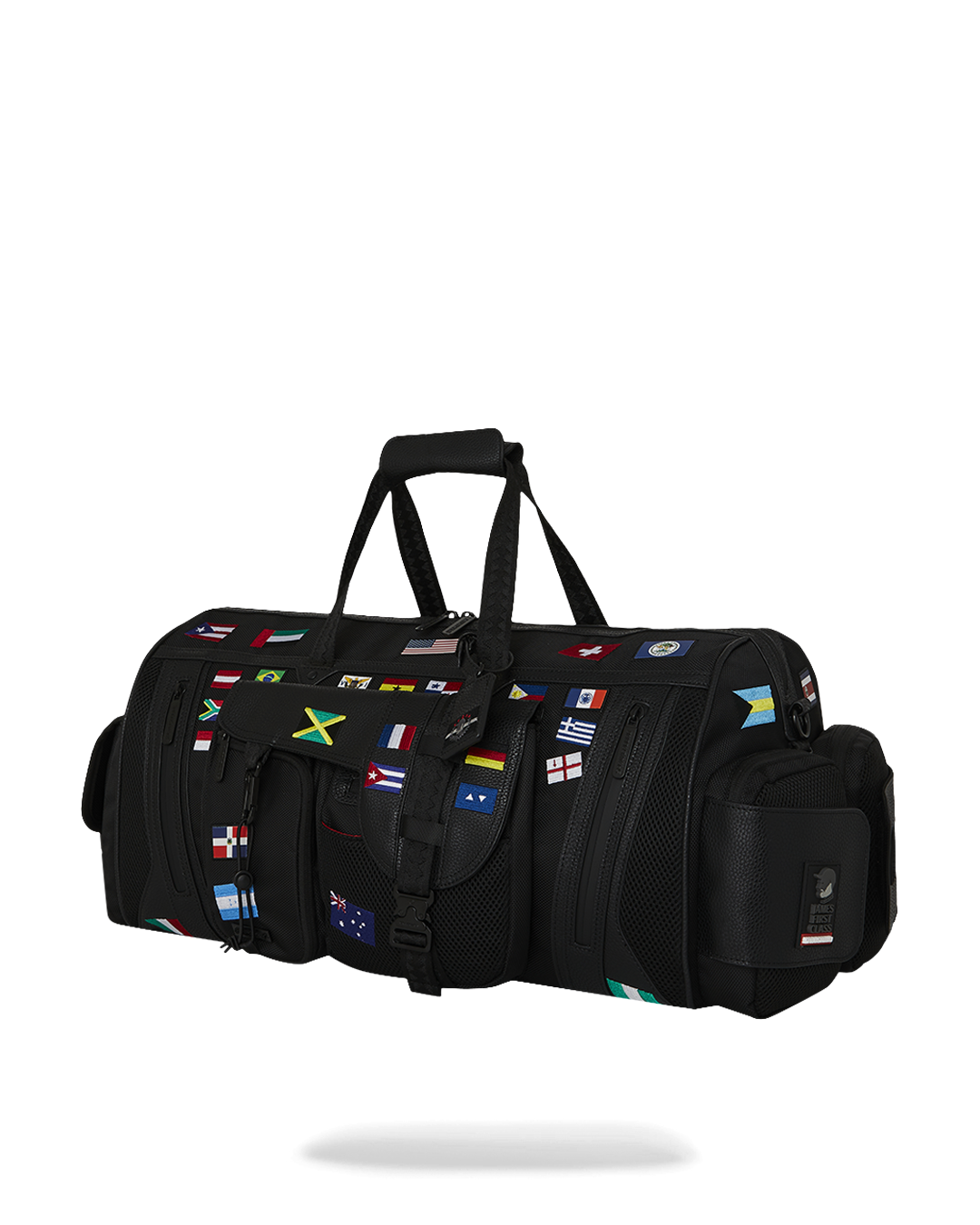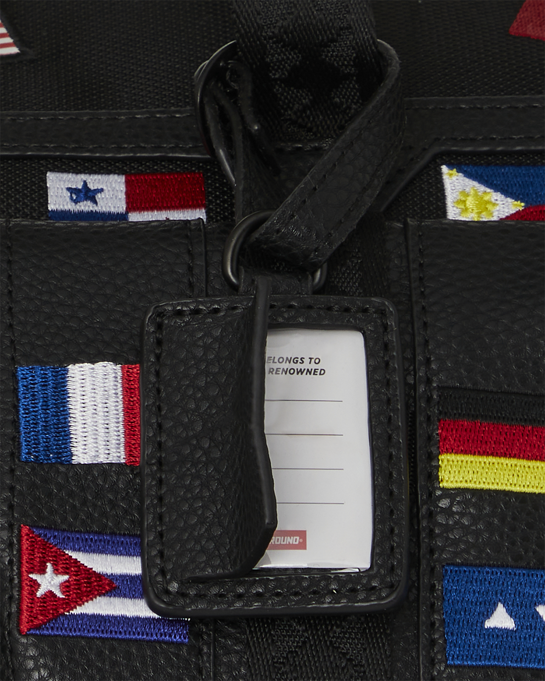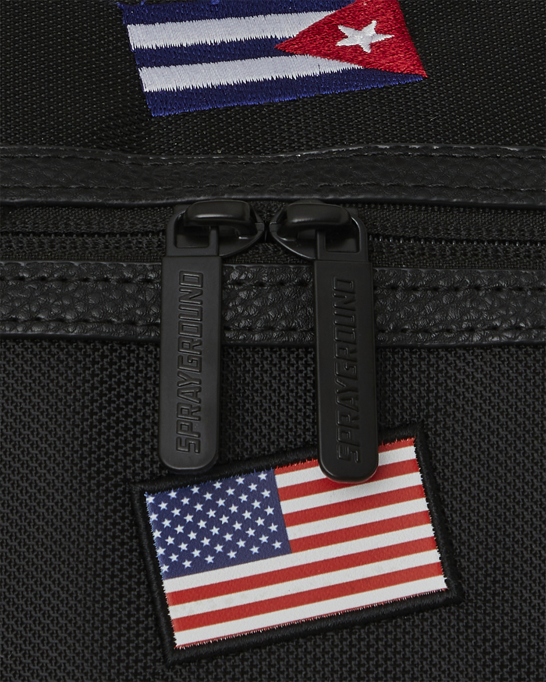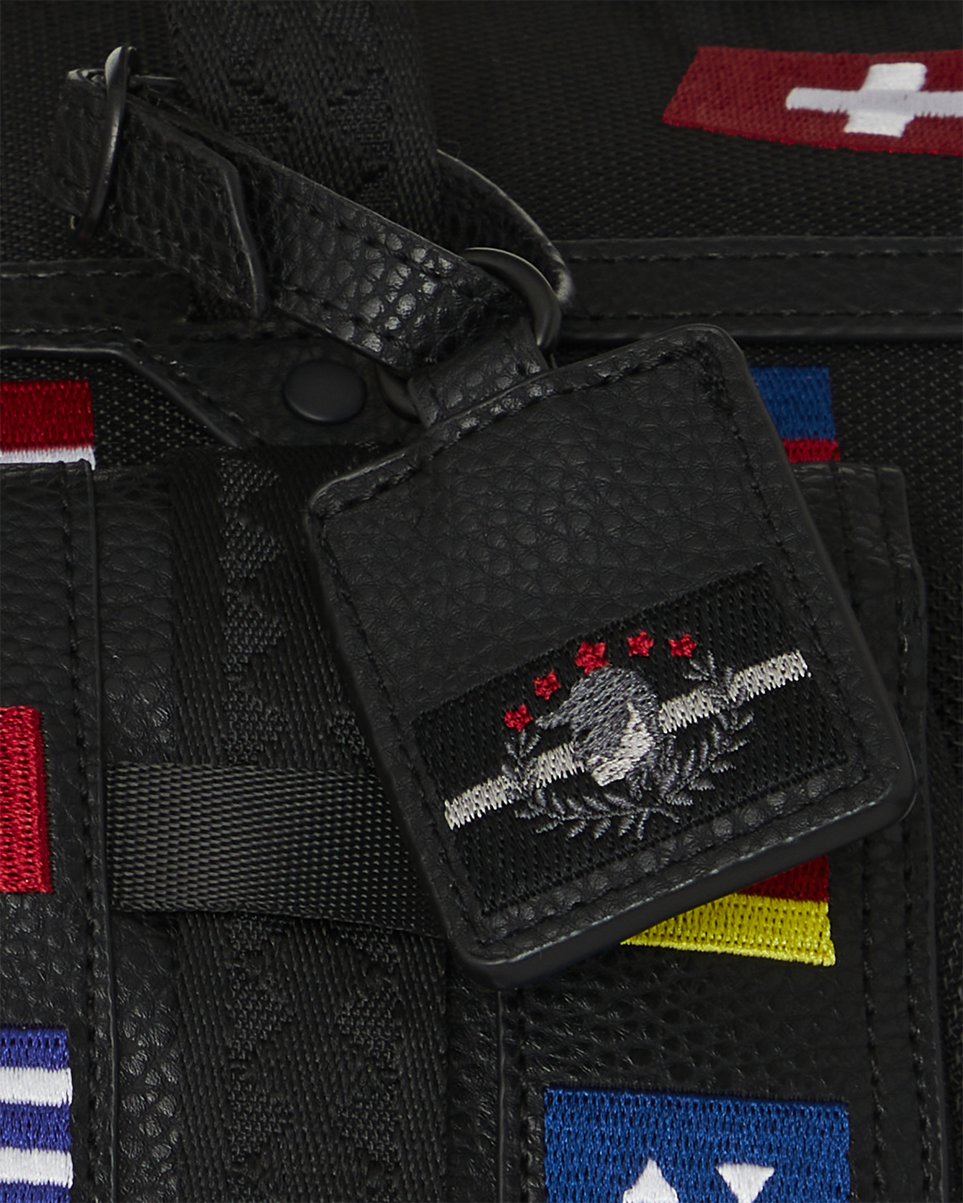 100% ballistic polyester embroidered with flag patches and?embossed details such as the sharkmouth and zipper pullers. Sewn faux leather details around the front zipper pocket.