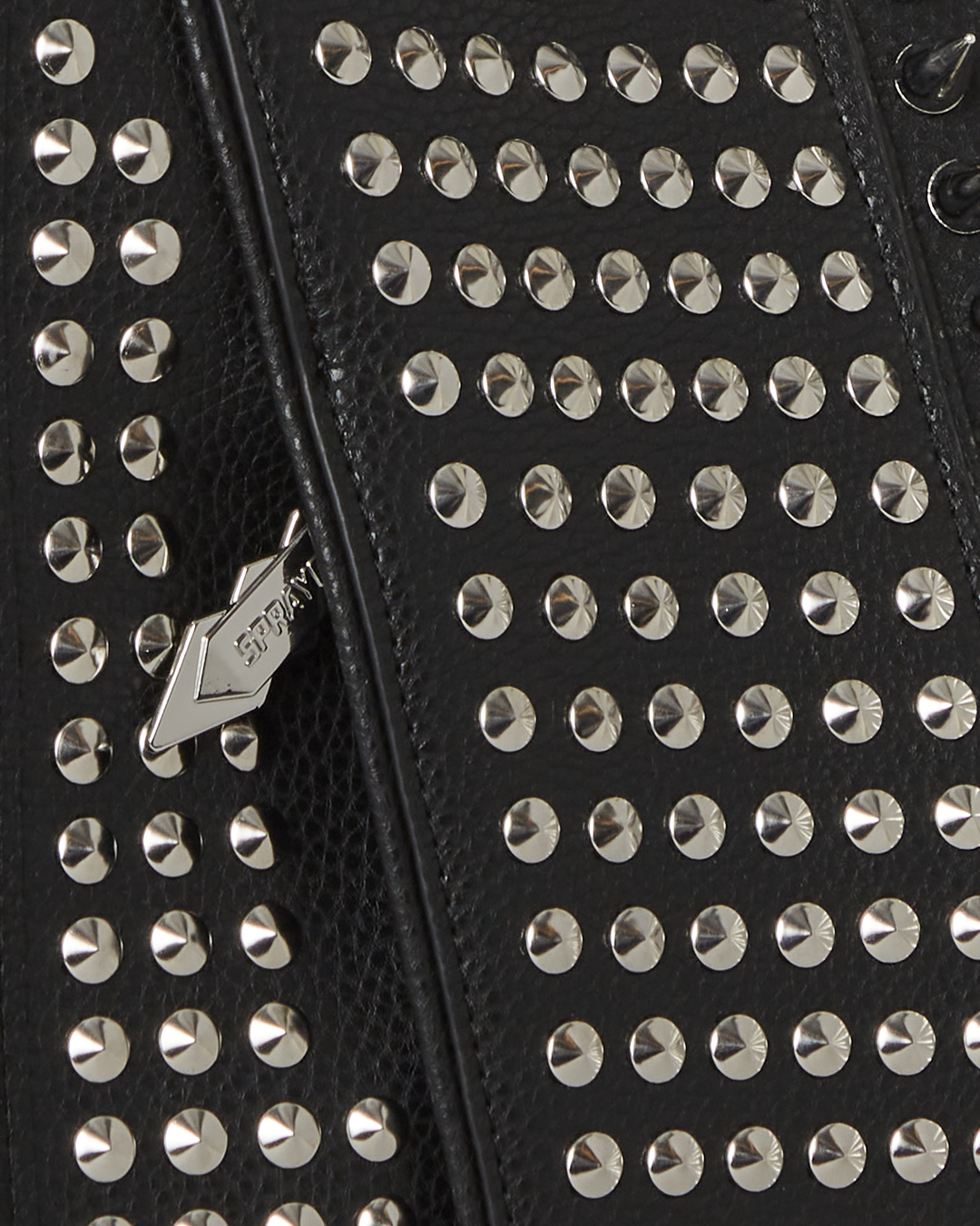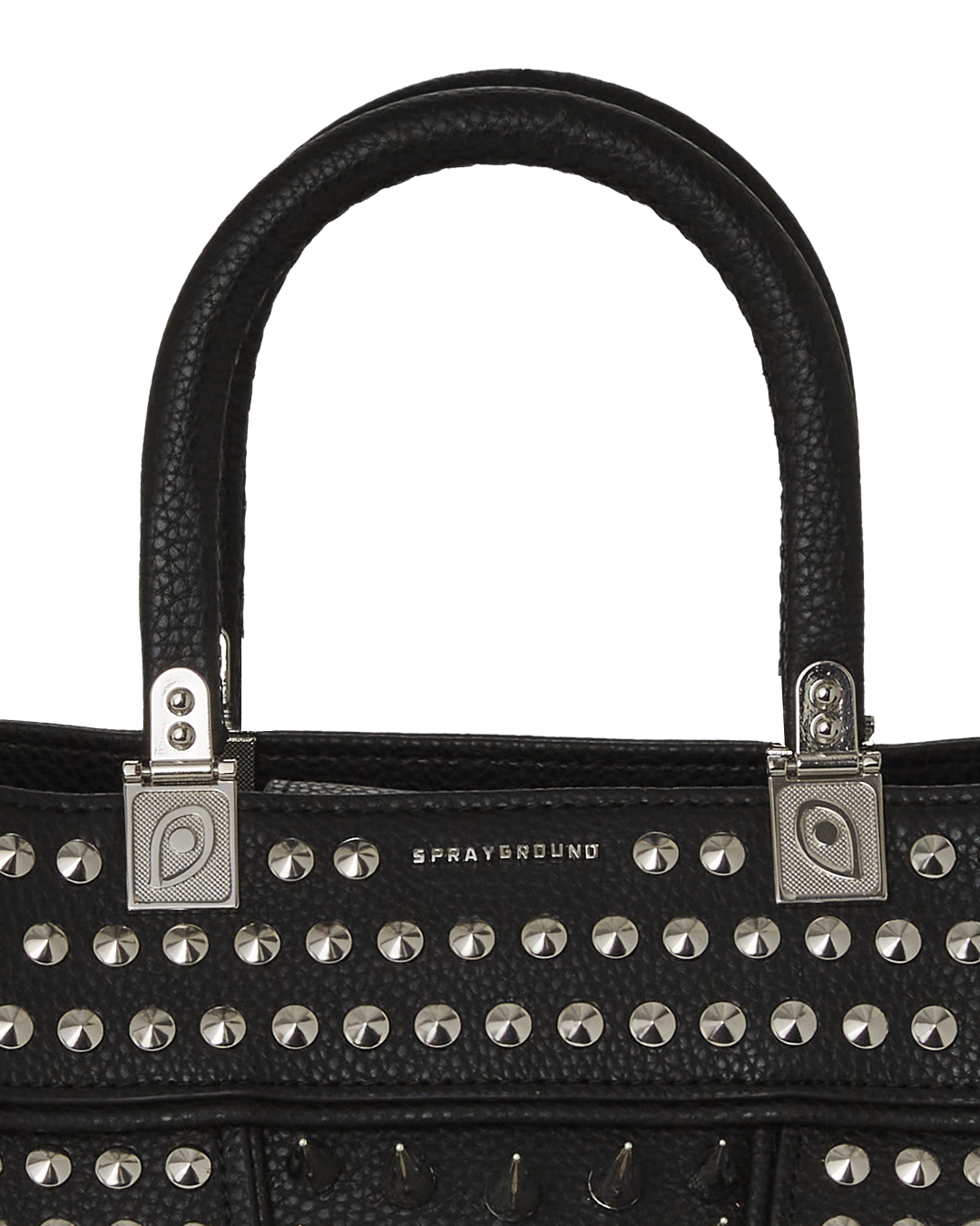 PVC leather with metal spikes and studs all over, metal handle tacks with PVC wrapped handle, attachable strap with more spikes and studs