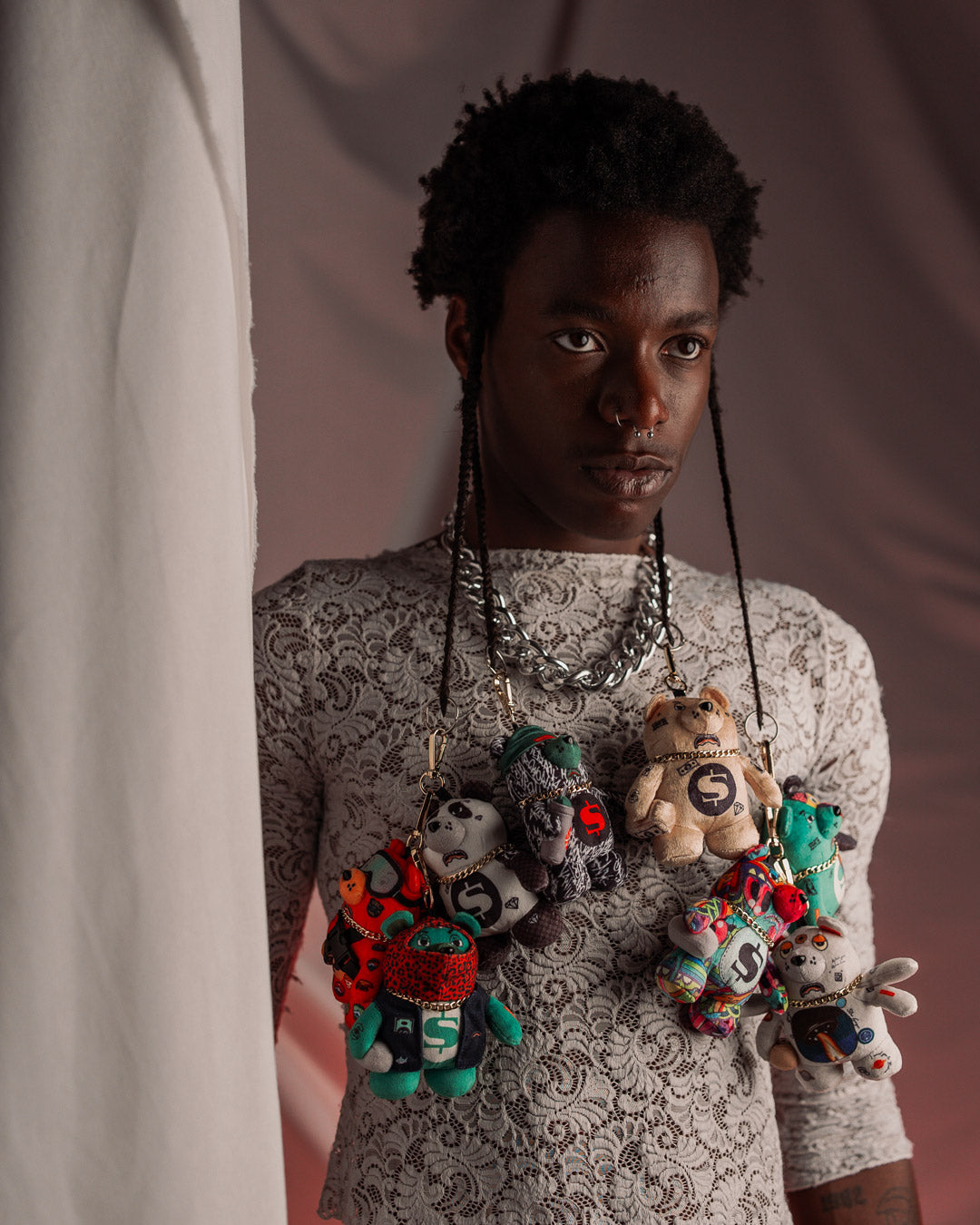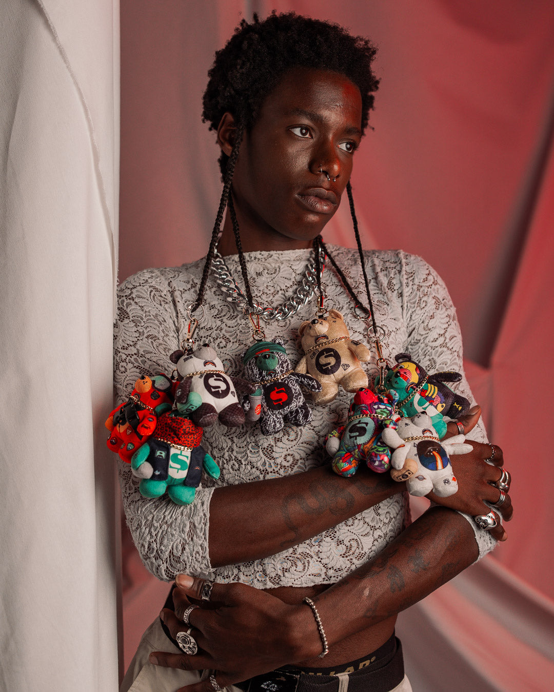 The Perfect Accessory. Plush bear keychain with miniature hat and spraypaint can and chain?