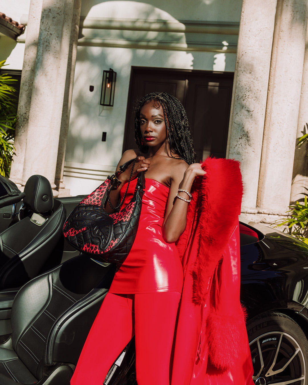 Quilted handbag with cut and sew leopard tear, an embossed sharkmouth, and a chained zipper puller.
