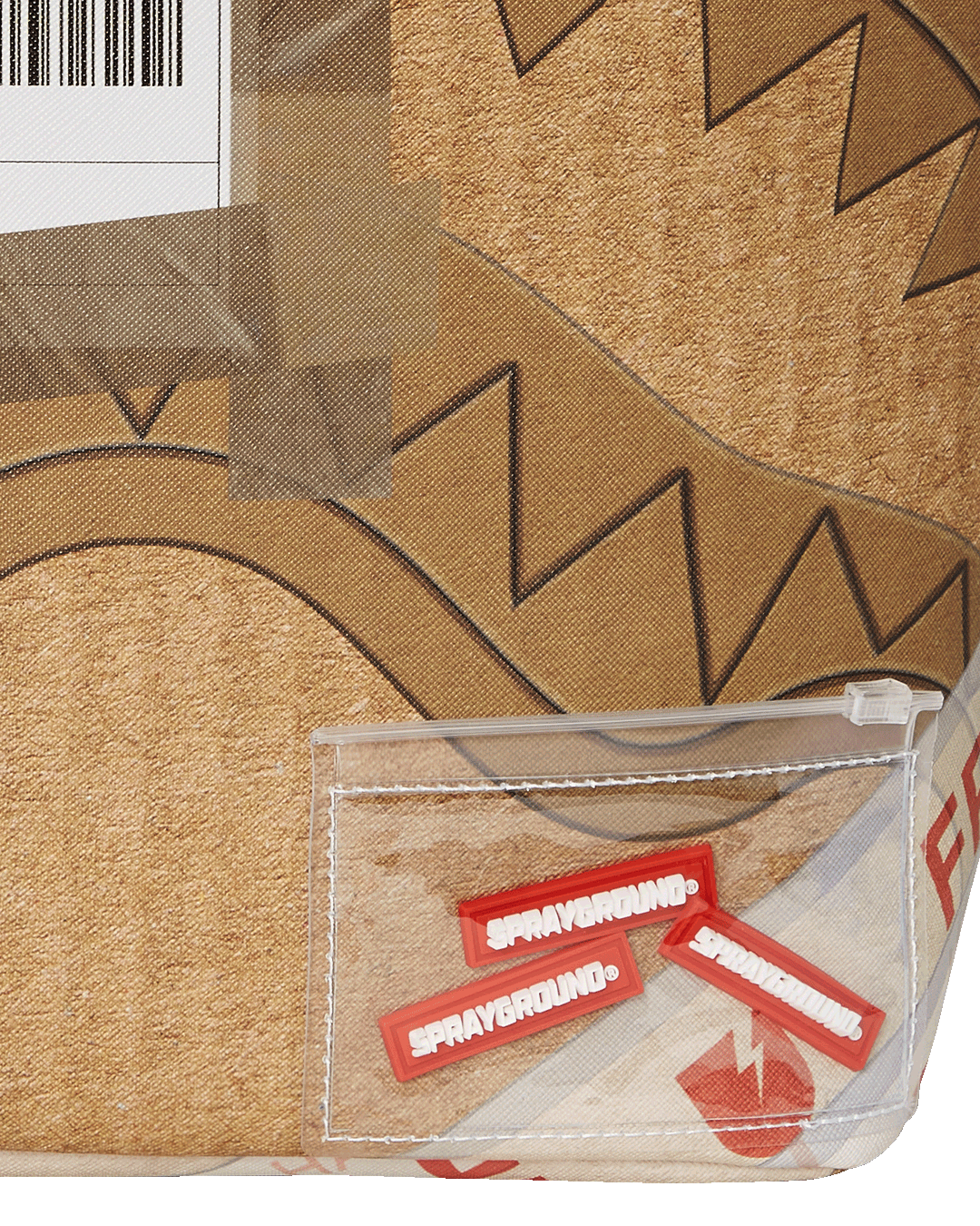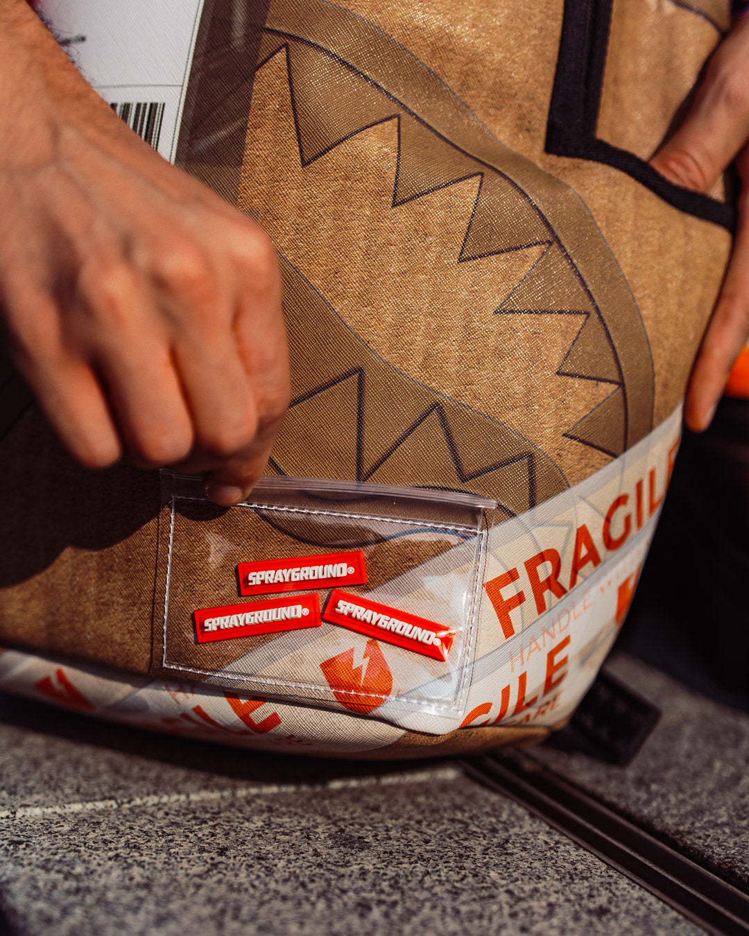 Ship your bag in SPRAYGROUND style! PVC backpack designed to look like a packed away box. Features zipper pocket with extra SPRAYGROUND emblems for decoration.