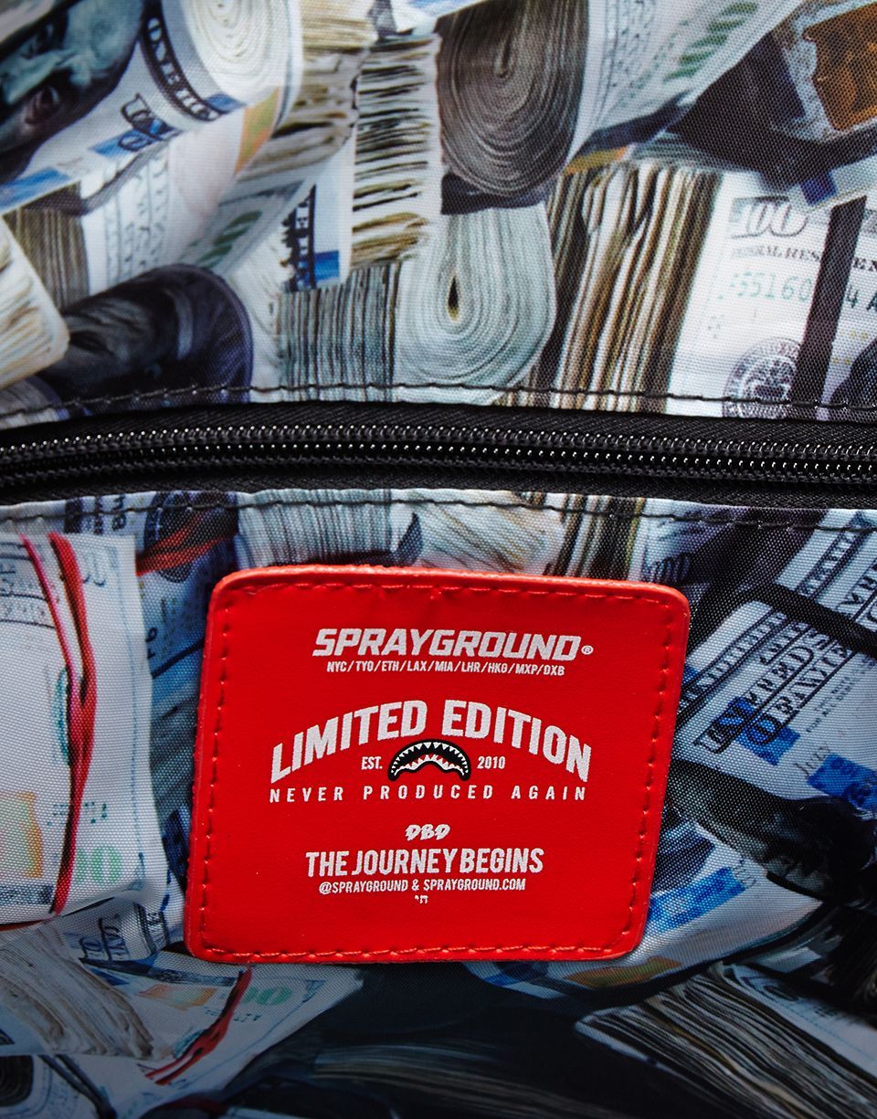 Dimensions: 20″ x 10″ x 10.75″ • Metal zipper pocket • Back Zippers • Zippered sneaker pocket • gold zippers • Adjustable Straps for custom sizing • Metal Zippers with Metal Hardware • bag of Sprayground money