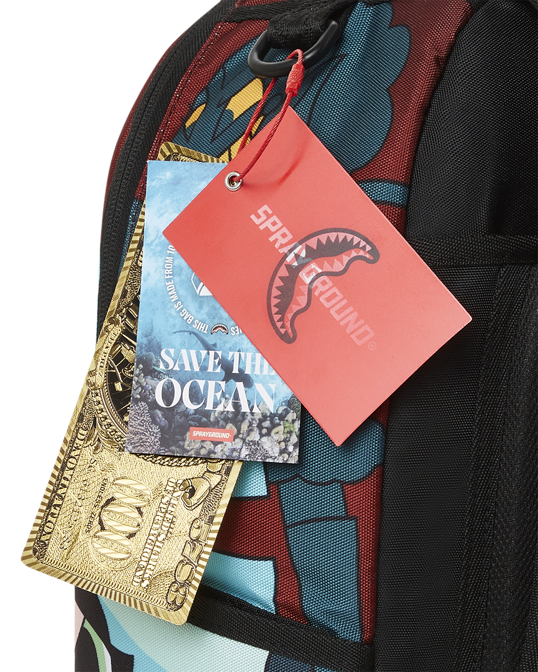 Dimensions: 18″ x 6″ x 11.5″ • Front zipper pocket • Side pockets • Zippered Stash pocket • Separate velour sunglass compartment • Ergonomic mesh back padding • Adjustable Straps for custom sizing • Gold zippers with metal hardware • Metal “Sprayground Authentic” badge • Slide through back sleeve connects to carry-on luggage to free your hands