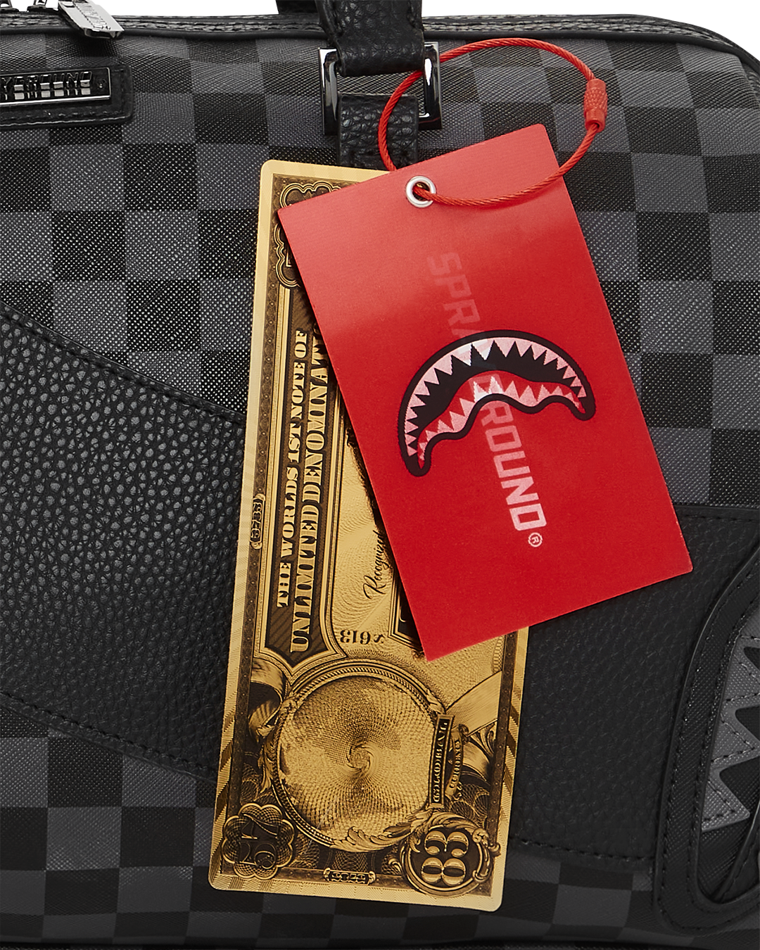 Dimensions: 8″ x 7.5″ x 13″ • Metal zipper pocket• Back Zippers •Zippered sneaker pocket • gold zippers • Adjustable Straps for custom sizing •Metal Zippers with Metal Hardware • bag of Sprayground money
