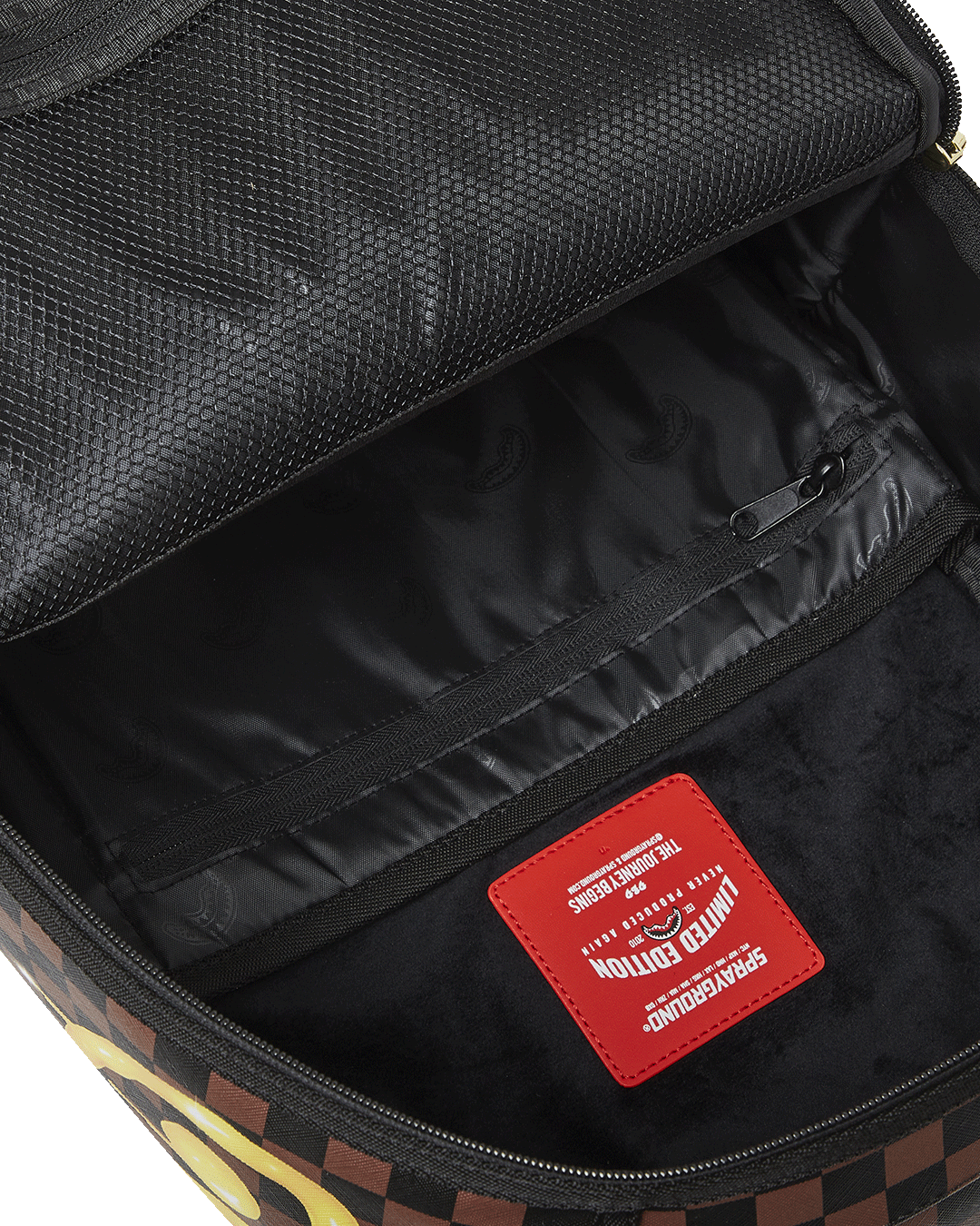 Dimensions: 18″ x 6″ x 11.5″ • Front zipper pocket • Side pockets • Zippered Stash pocket • Separate velour sunglass compartment • Ergonomic mesh back padding • Adjustable Straps for custom sizing • Gold zippers with metal hardware • Metal “Sprayground Authentic” badge • Slide through back sleeve connects to carry-on luggage to free your hands
