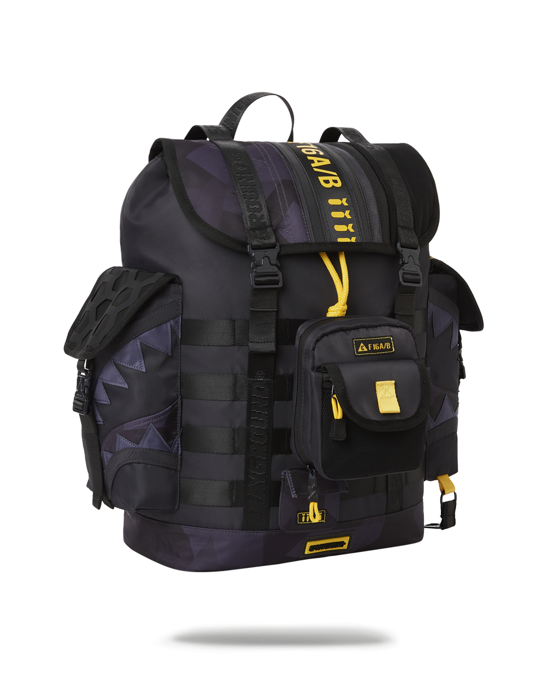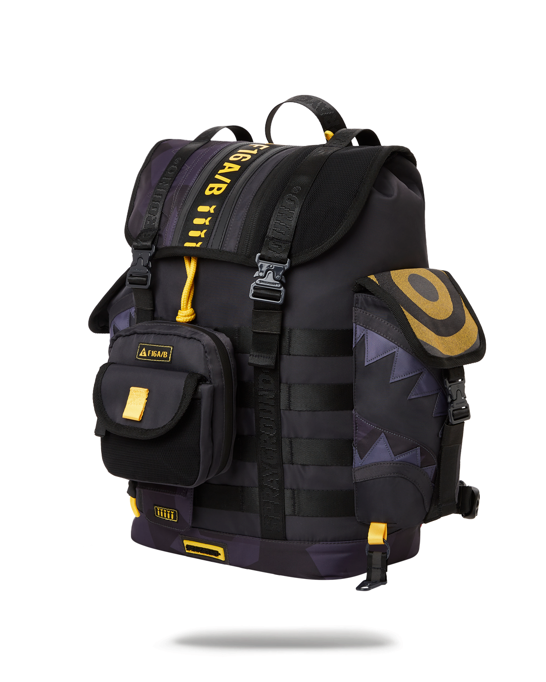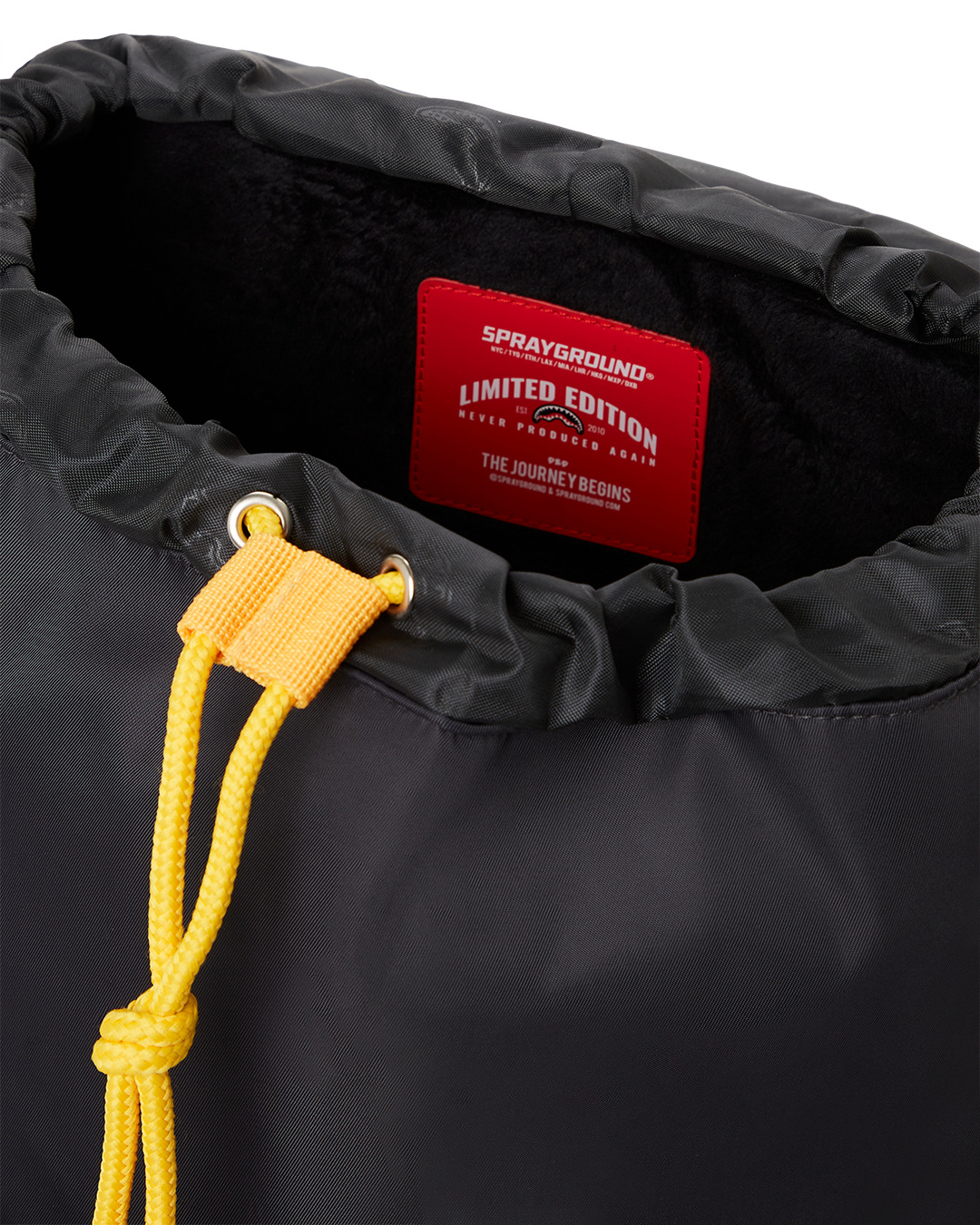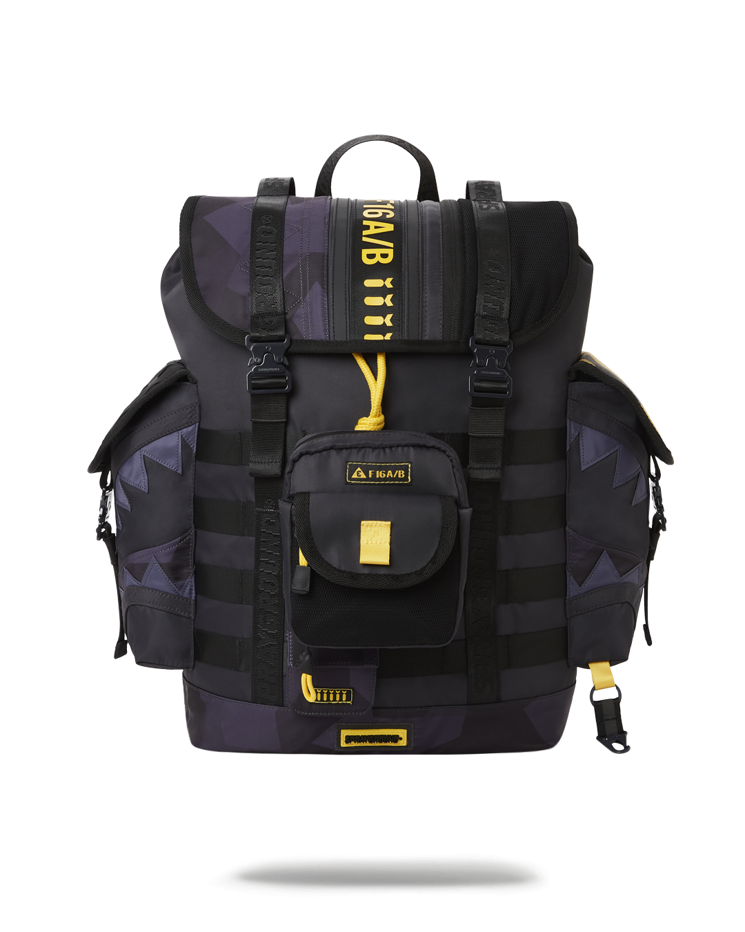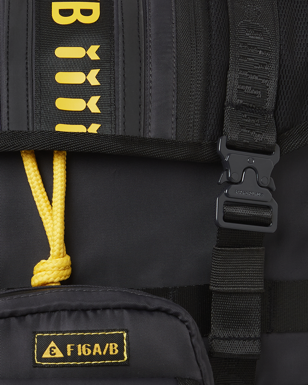 Fabric made from polyester satin weave with monochromatic camo details and contrast yellow trims