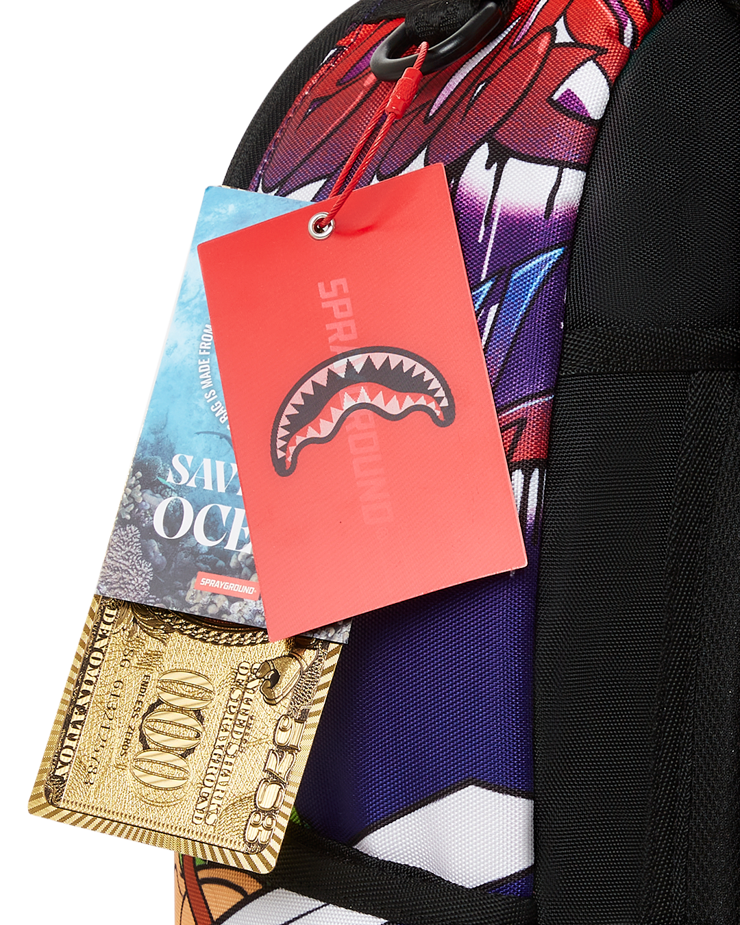 Dimensions: 18″ x 6″ x 11.5″ • Front zipper pocket • Side pockets • Zippered Stash pocket • Separate velour sunglass compartment • Ergonomic mesh back padding • Adjustable Straps for custom sizing • Gold zippers with metal hardware • Metal “Sprayground Authentic” badge • Slide through back sleeve connects to carry-on luggage to free your hands