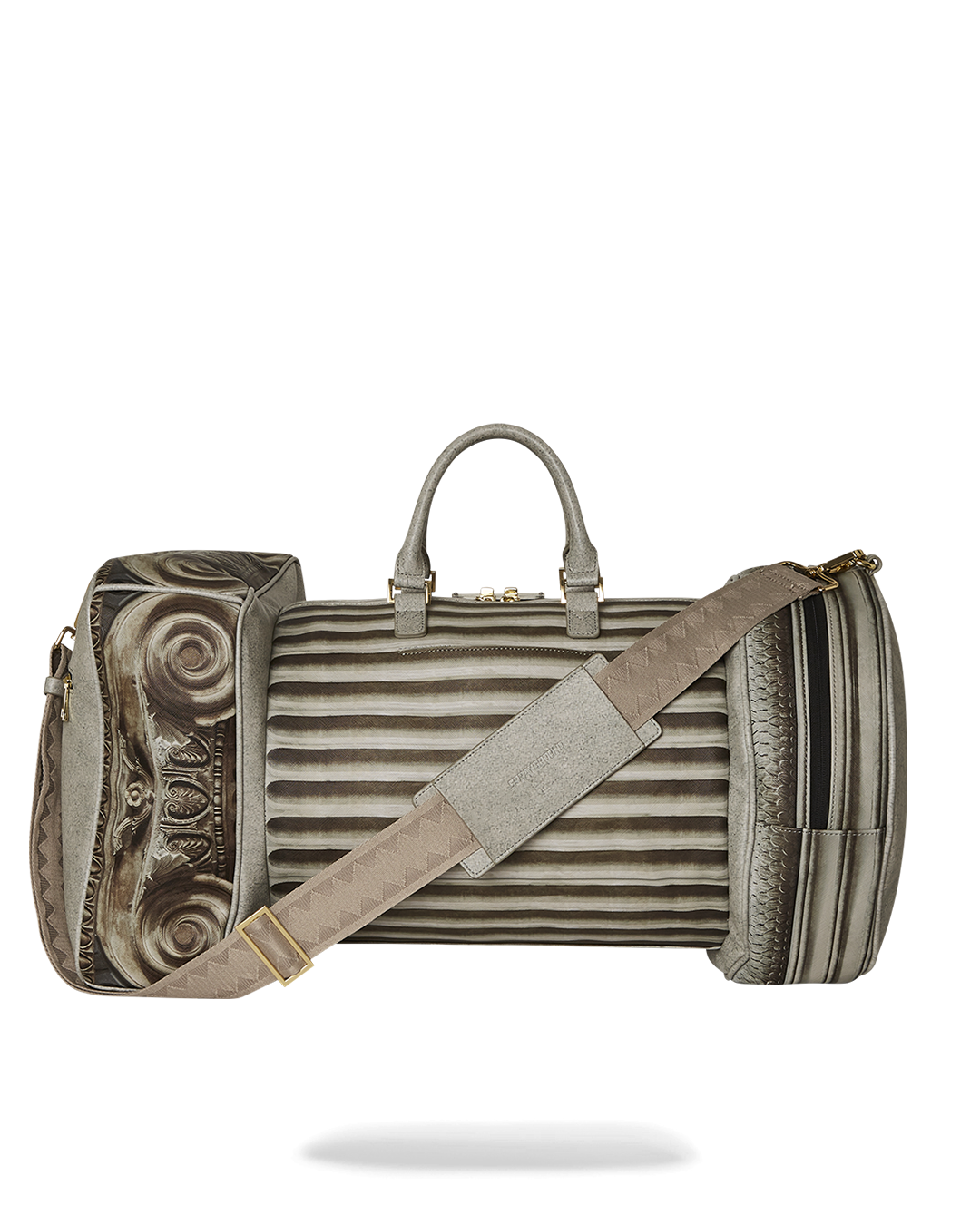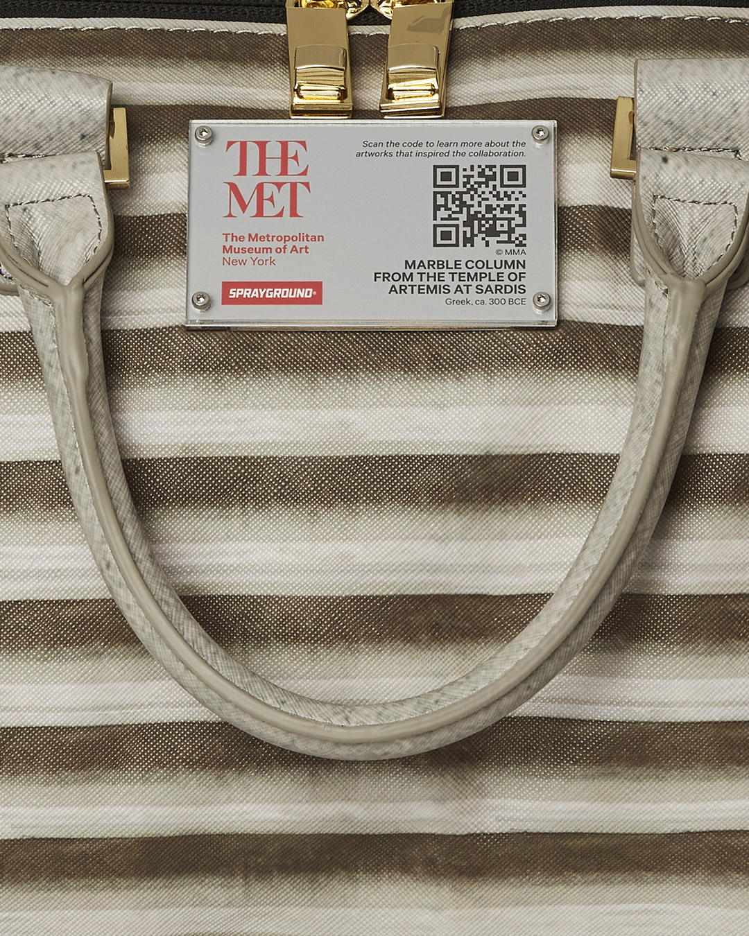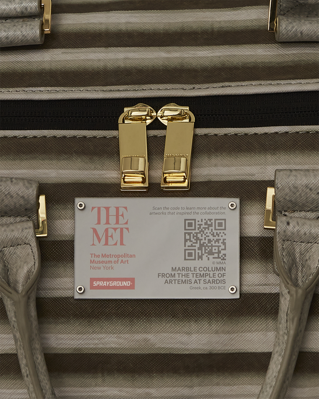 The massive section of a column (ca. 300 BCE) from the Greek Temple of Artemis at Sardis is transformed into a Sprayground duffle bag. The column has been turned on its side and adapts the delicate foliate carvings on its capital—a unique characteristic among extant capitals from the temple. Though the original column once towered at over 58 feet high, its capital is slightly smaller than others found at the site.
