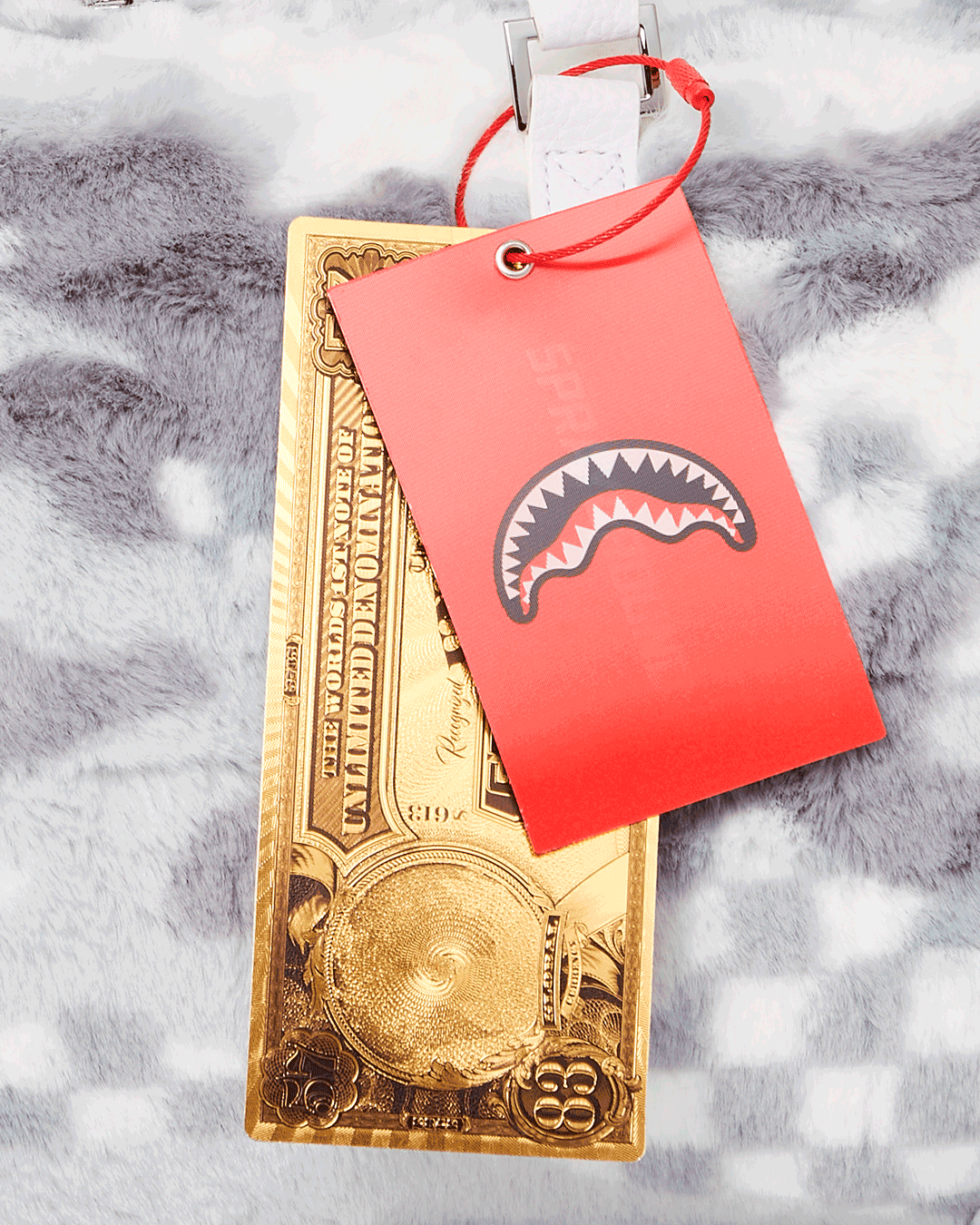 Dimensions: 8″ x 7.5″ x 13″• Metal zipper pocket• Back Zippers •Zippered sneaker pocket • gold zippers • Adjustable Straps for custom sizing •Metal Zippers with Metal Hardware • bag of Sprayground money