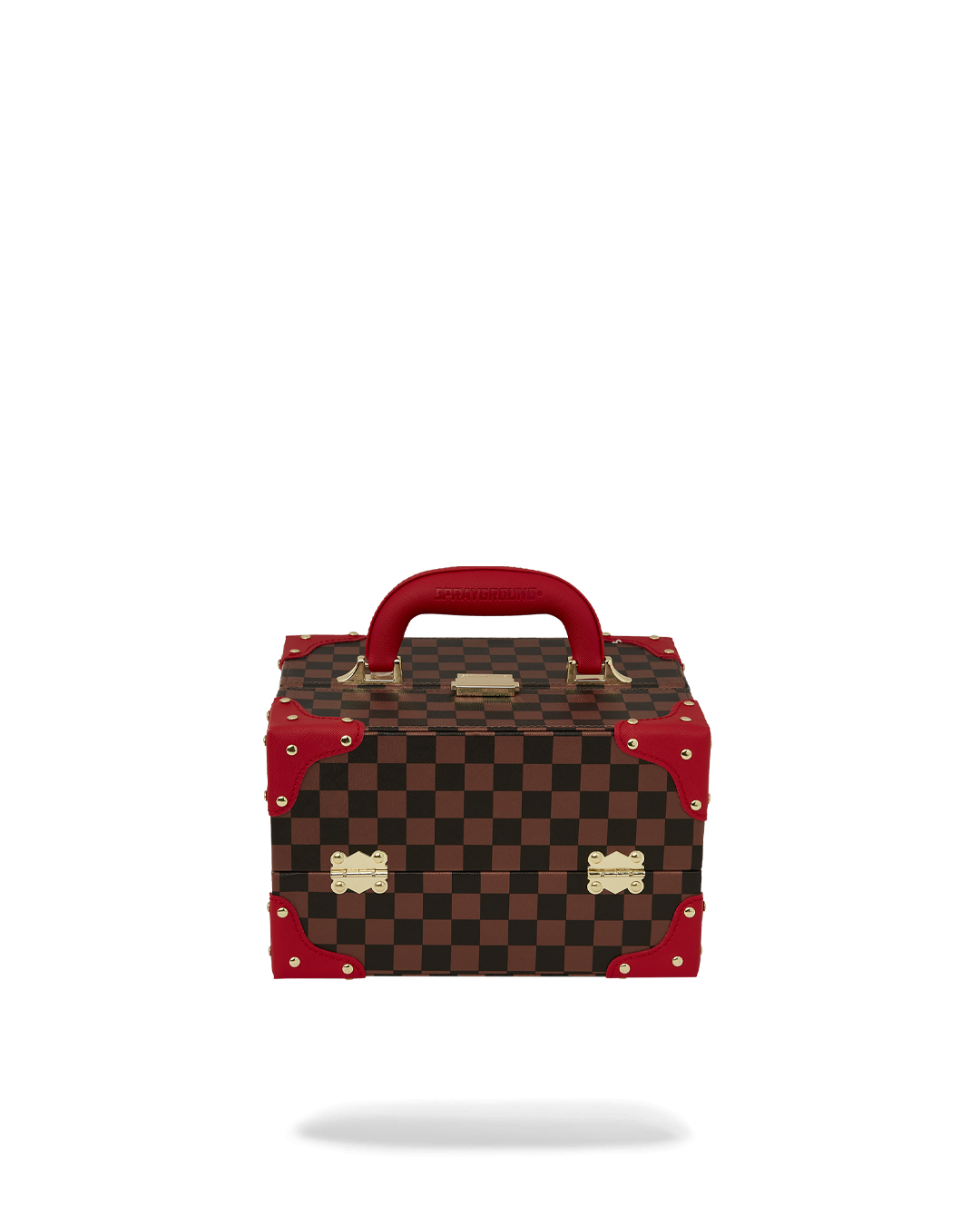 Red velour lining, Tiered shelving, removable tray, interior mirror.