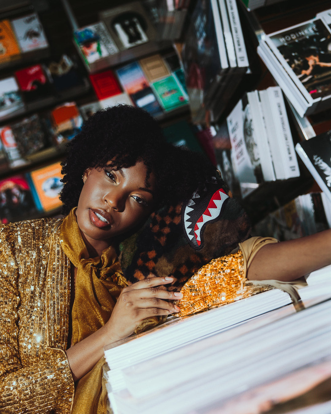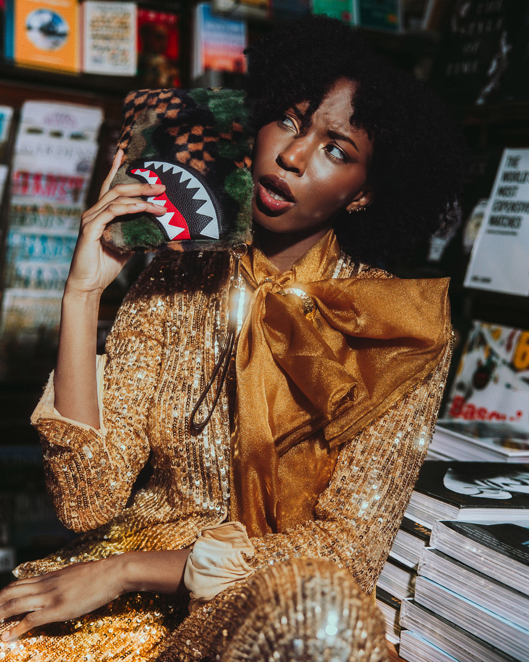 NOIR QUILT GOLD CHAIN SHARK CROSSOVER CLUTCH