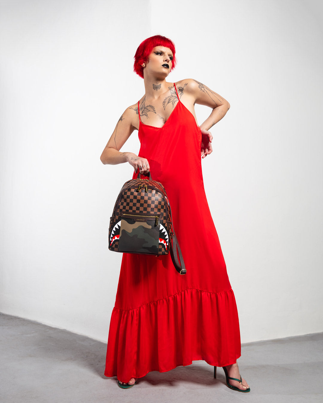 Dimensions: 10″ x 5″ x 11.5″ • Two large main zippered compartments • Side pockets • Zippered Stash pocket • Adjustable straps for custom sizing • Gold zippers with metal hardware