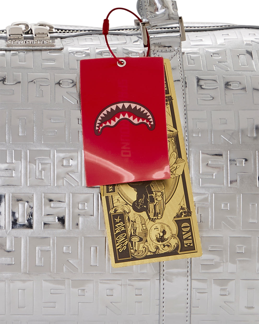 Embossed Sprayground logo on Metallic Silver PU with mirror-like shine