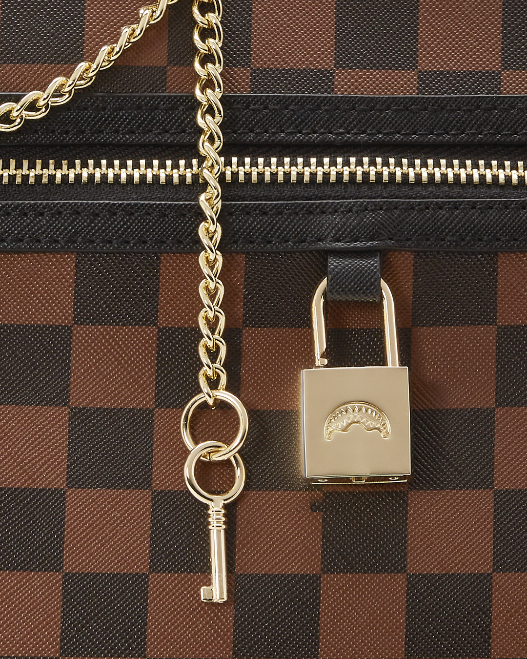 Dimensions: 19″ x 6.5″ x 11.5″ ? Top zipper opening ? Top double handle ? Sprayground keychain ? Gold zippers with metal hardware