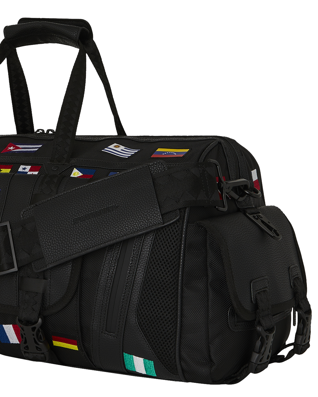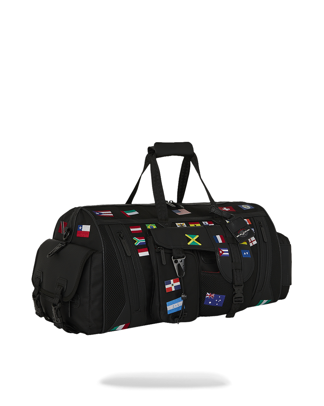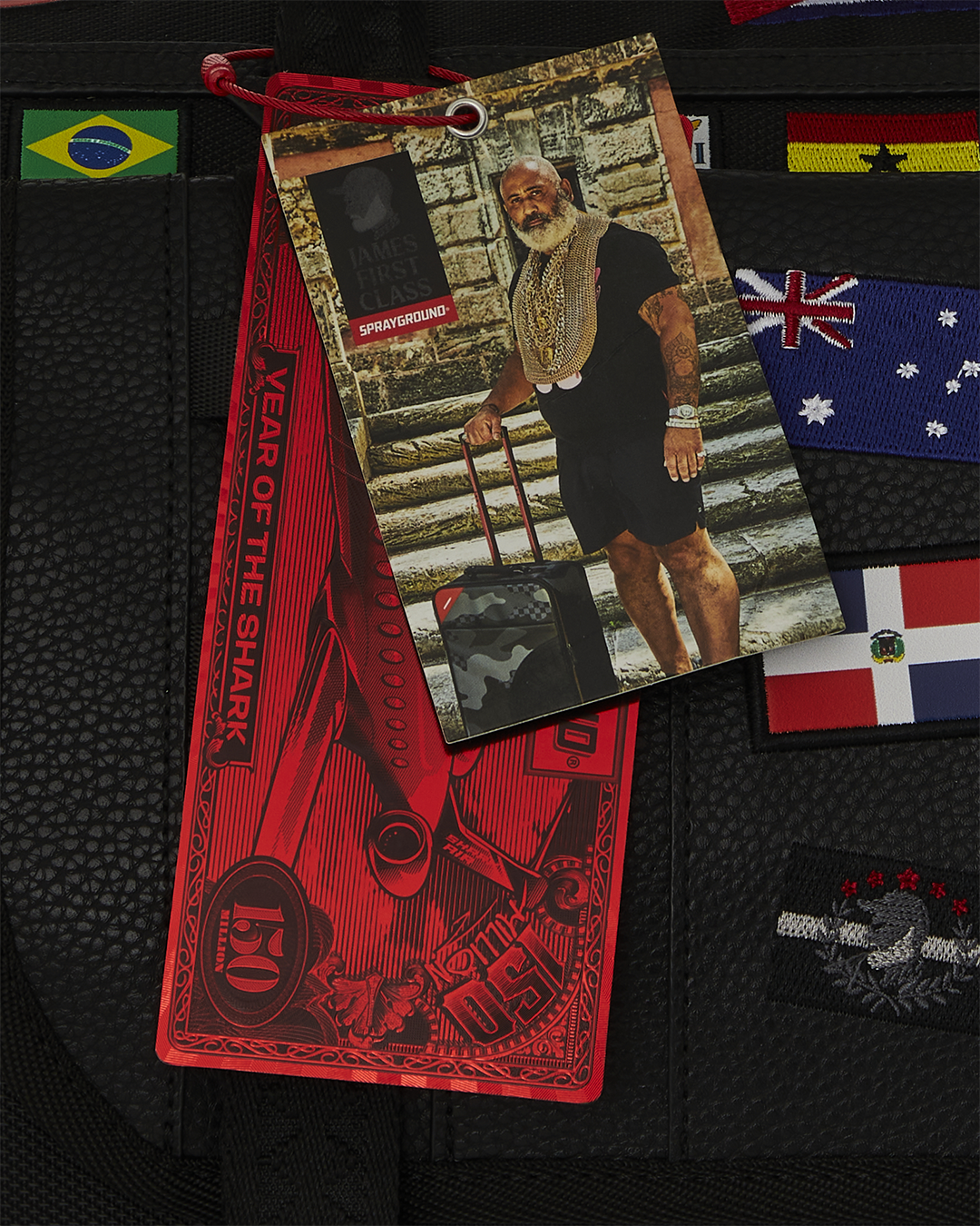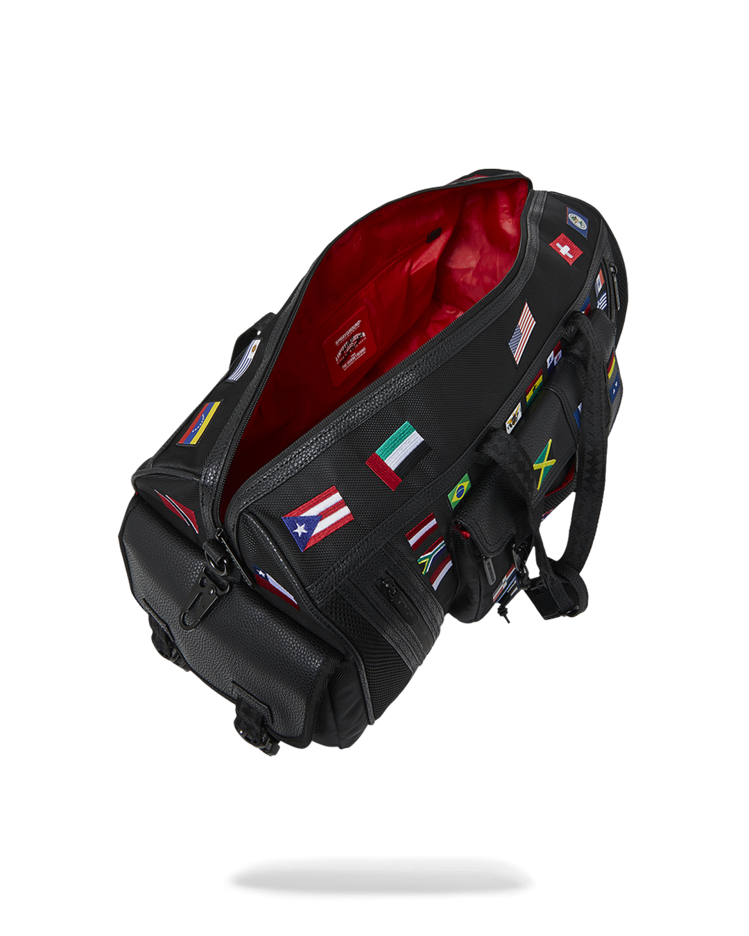 100% ballistic polyester embroidered with flag patches and?embossed details such as the sharkmouth and zipper pullers. Sewn faux leather details around the front zipper pocket.