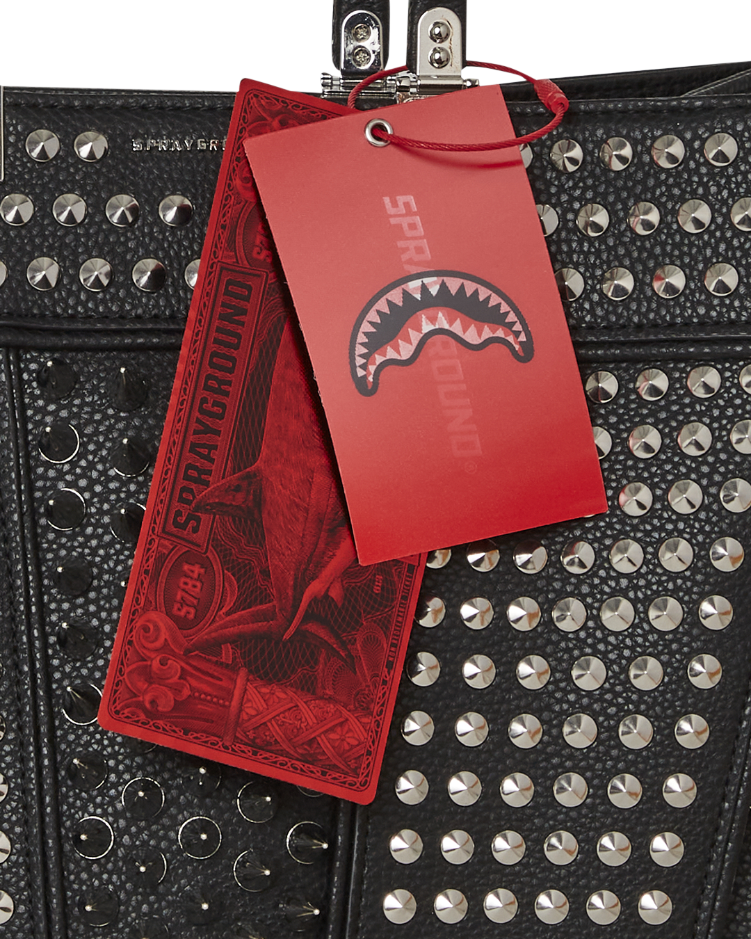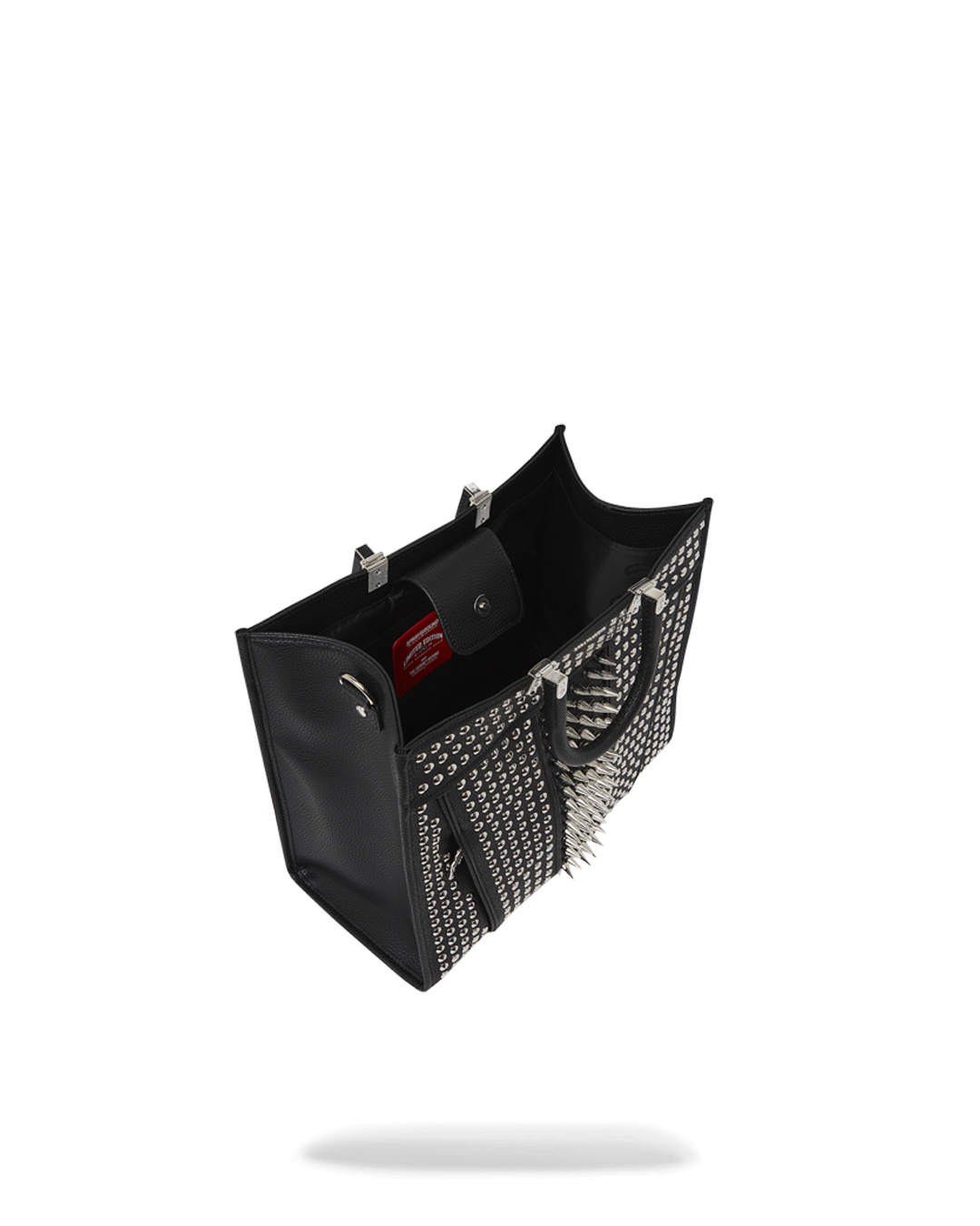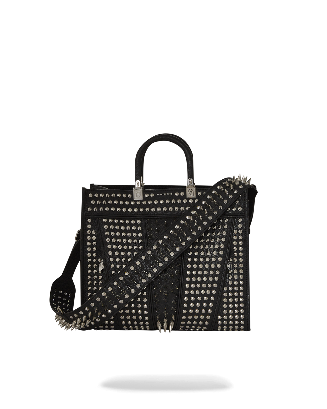 PVC leather with metal spikes and studs all over, metal handle tacks with PVC wrapped handle, attachable strap with more spikes and studs