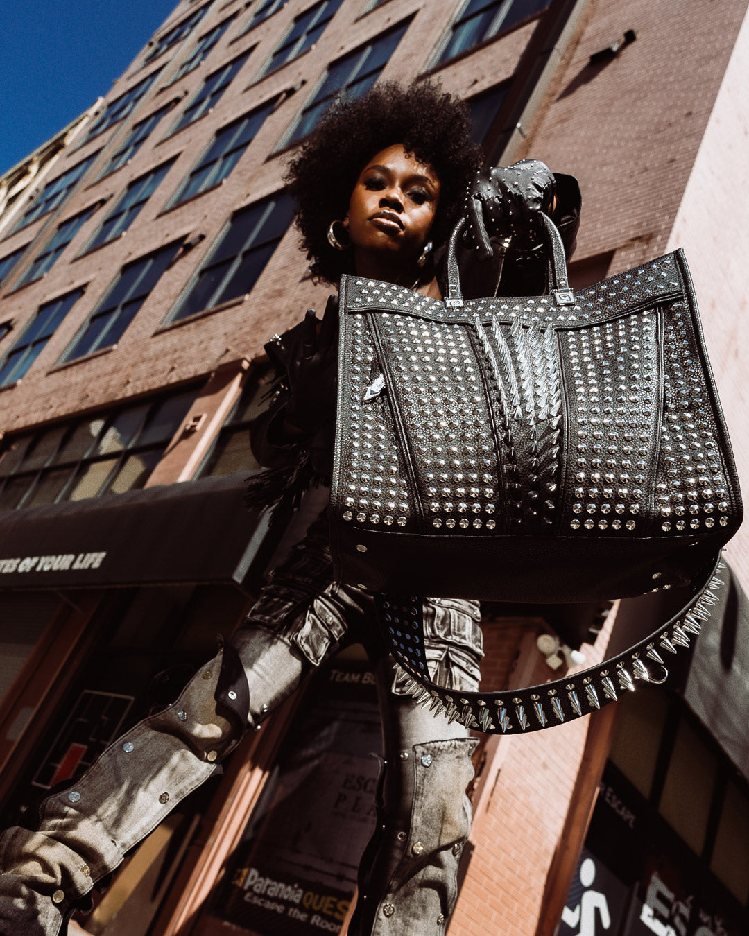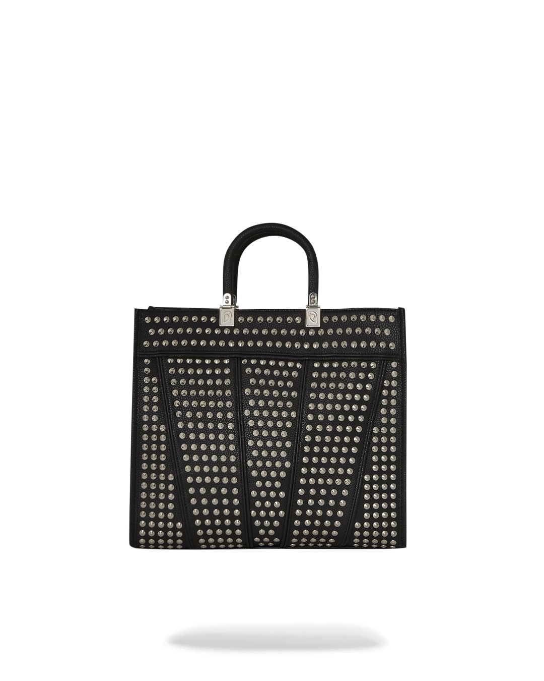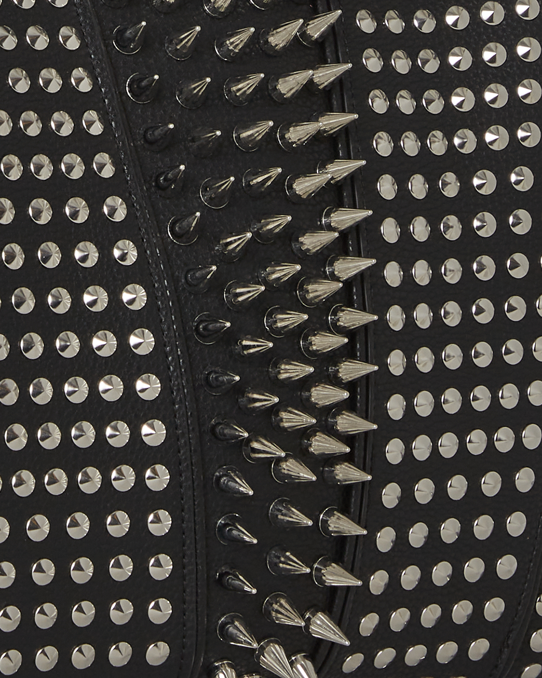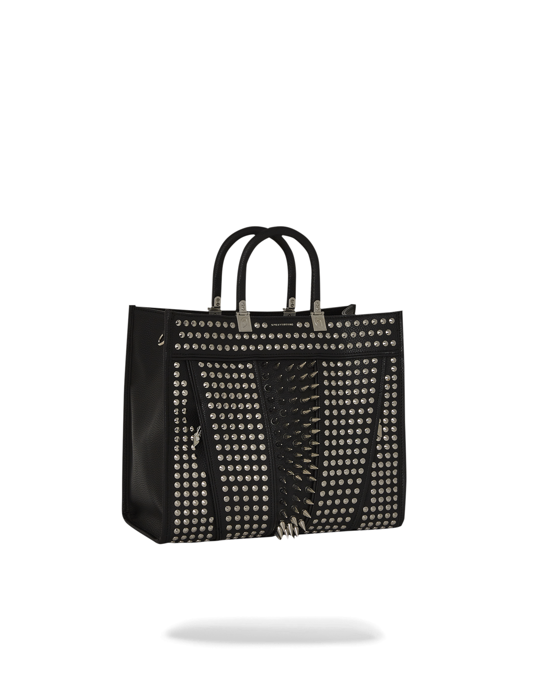 PVC leather with metal spikes and studs all over, metal handle tacks with PVC wrapped handle, attachable strap with more spikes and studs