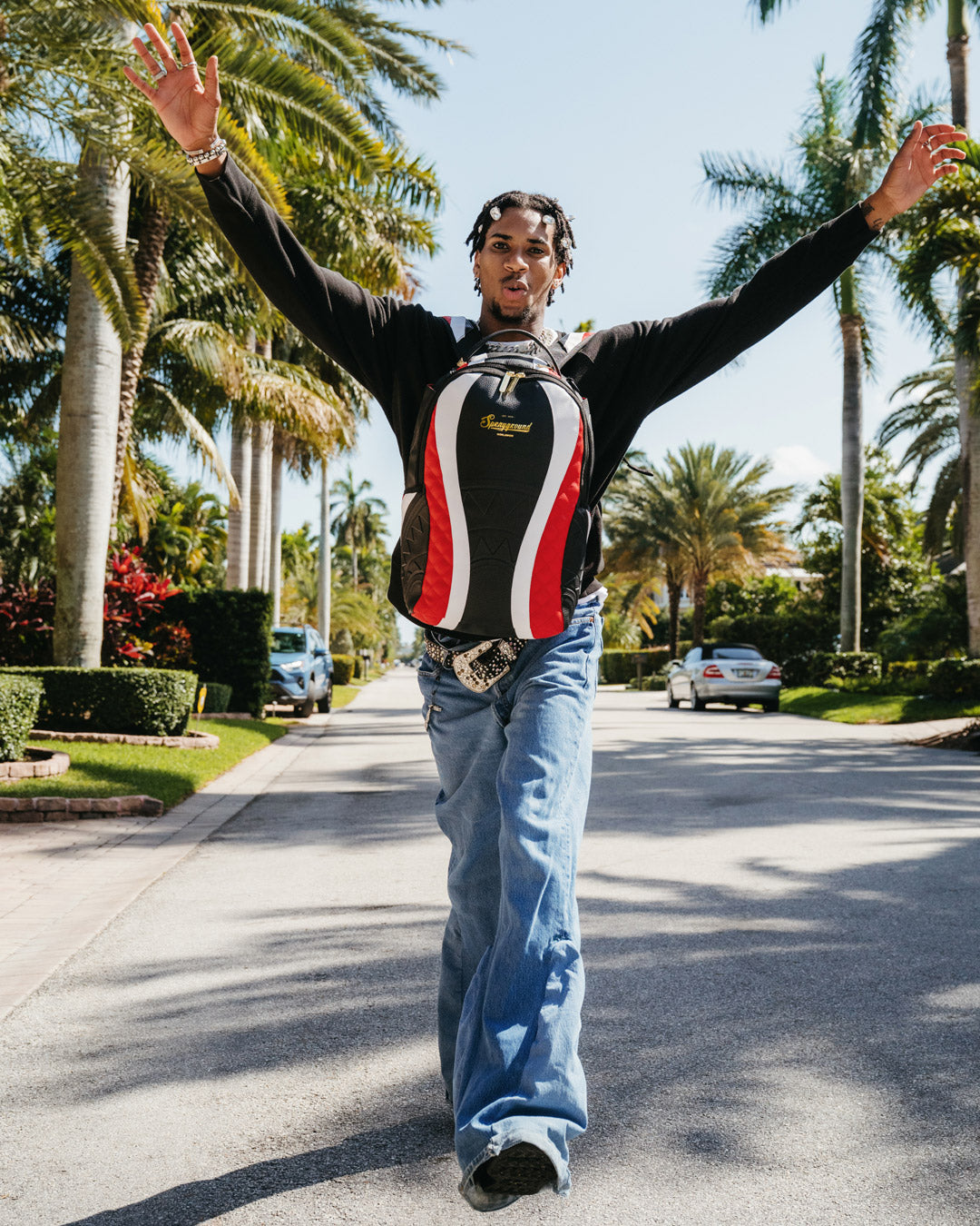 Dimensions: 18″ x 6″ x 11.5″ ? Front zipper pocket ? Side pockets ? Zippered Stash pocket ? Separate velour sunglass compartment ? Ergonomic mesh back padding ? Adjustable Straps for custom sizing ? Gold zippers with metal hardware ? Metal “Sprayground Authentic” badge ? Slide through back sleeve connects to carry-on luggage to free your hands