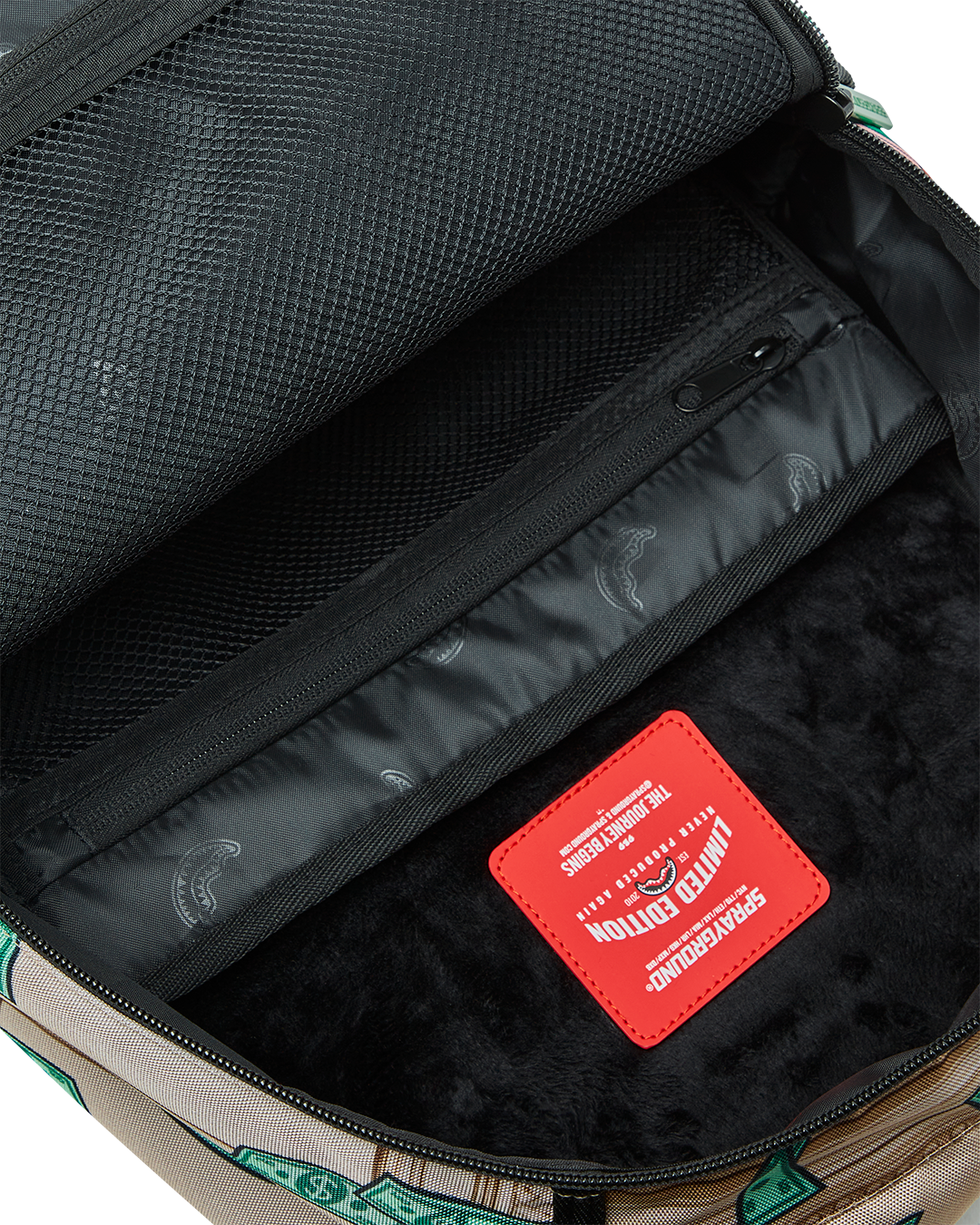 Dimensions: 18″ x 6″ x 11.5″ • Front zipper pocket • Side pockets • Zippered Stash pocket • Separate velour sunglass compartment • Ergonomic mesh back padding • Adjustable Straps for custom sizing • Gold zippers with metal hardware • Metal “Sprayground Authentic” badge • Slide through back sleeve connects to carry-on luggage to free your hands