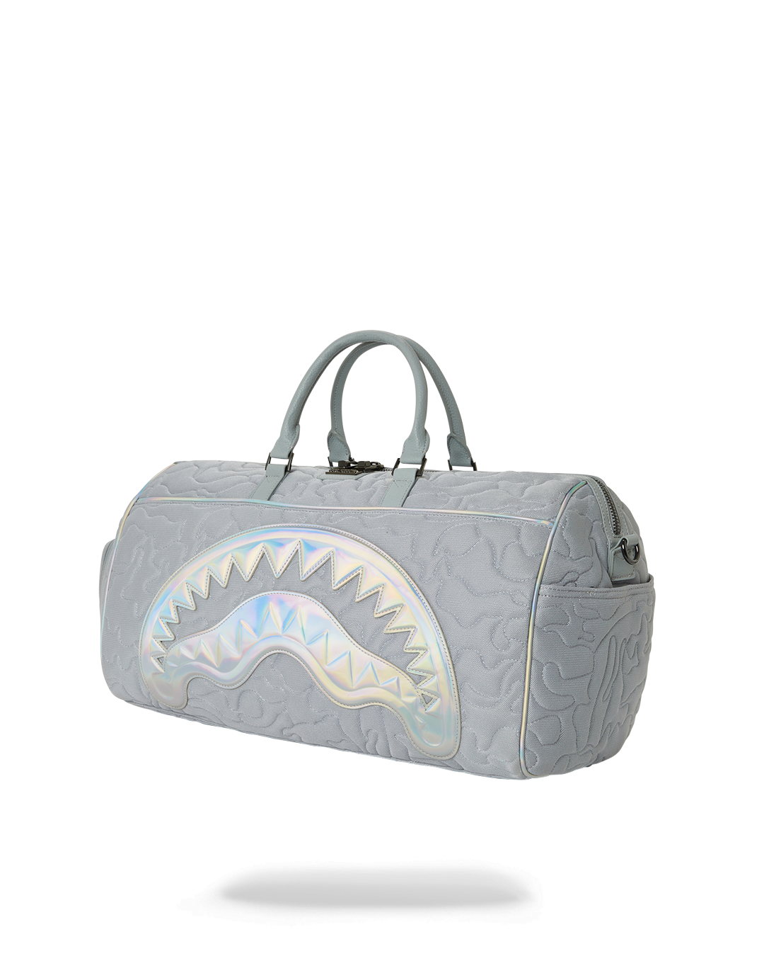 The styles are trimmed with matching faux leather trims and accented with iridescent welded shark mouths and gunmetal hardware.