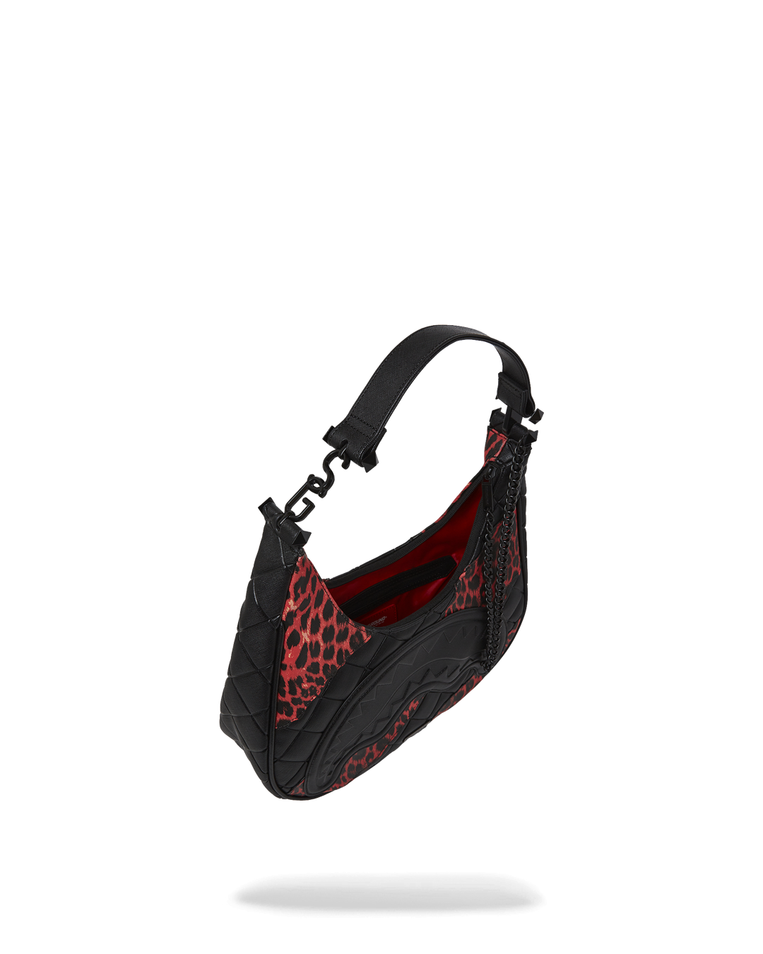Quilted handbag with cut and sew leopard tear, an embossed sharkmouth, and a chained zipper puller.
