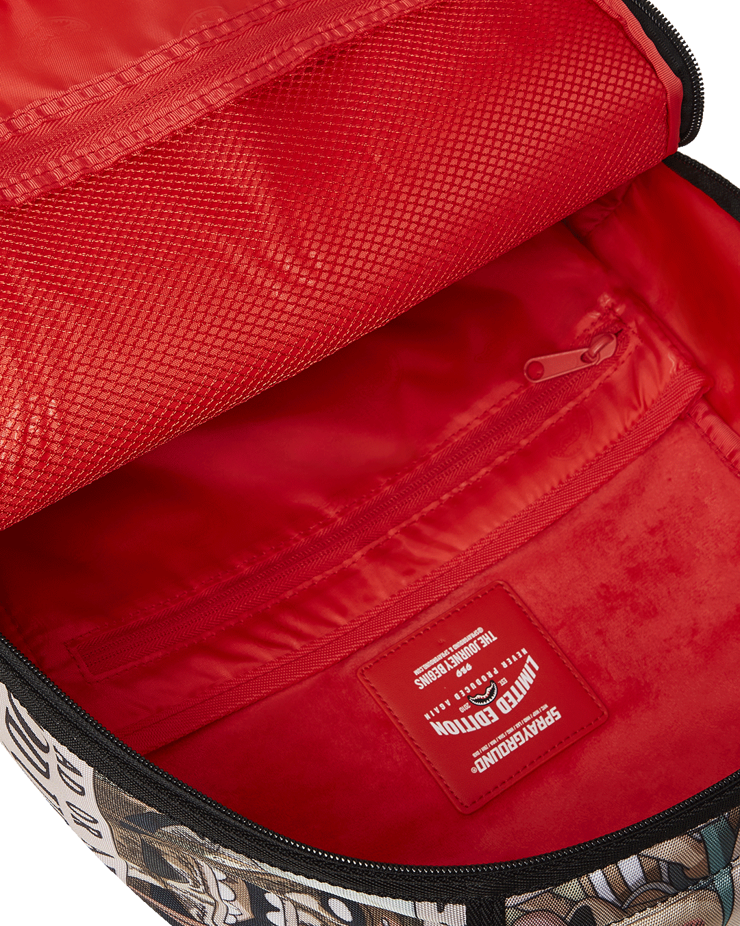 Dimensions: 18″ x 6″ x 11.5″ • Front zipper pocket • Side pockets • Zippered Stash pocket • Separate velour sunglass compartment • Ergonomic mesh back padding • Adjustable Straps for custom sizing • Gold zippers with metal hardware • Metal “Sprayground Authentic” badge • Slide through back sleeve connects to carry-on luggage to free your hands