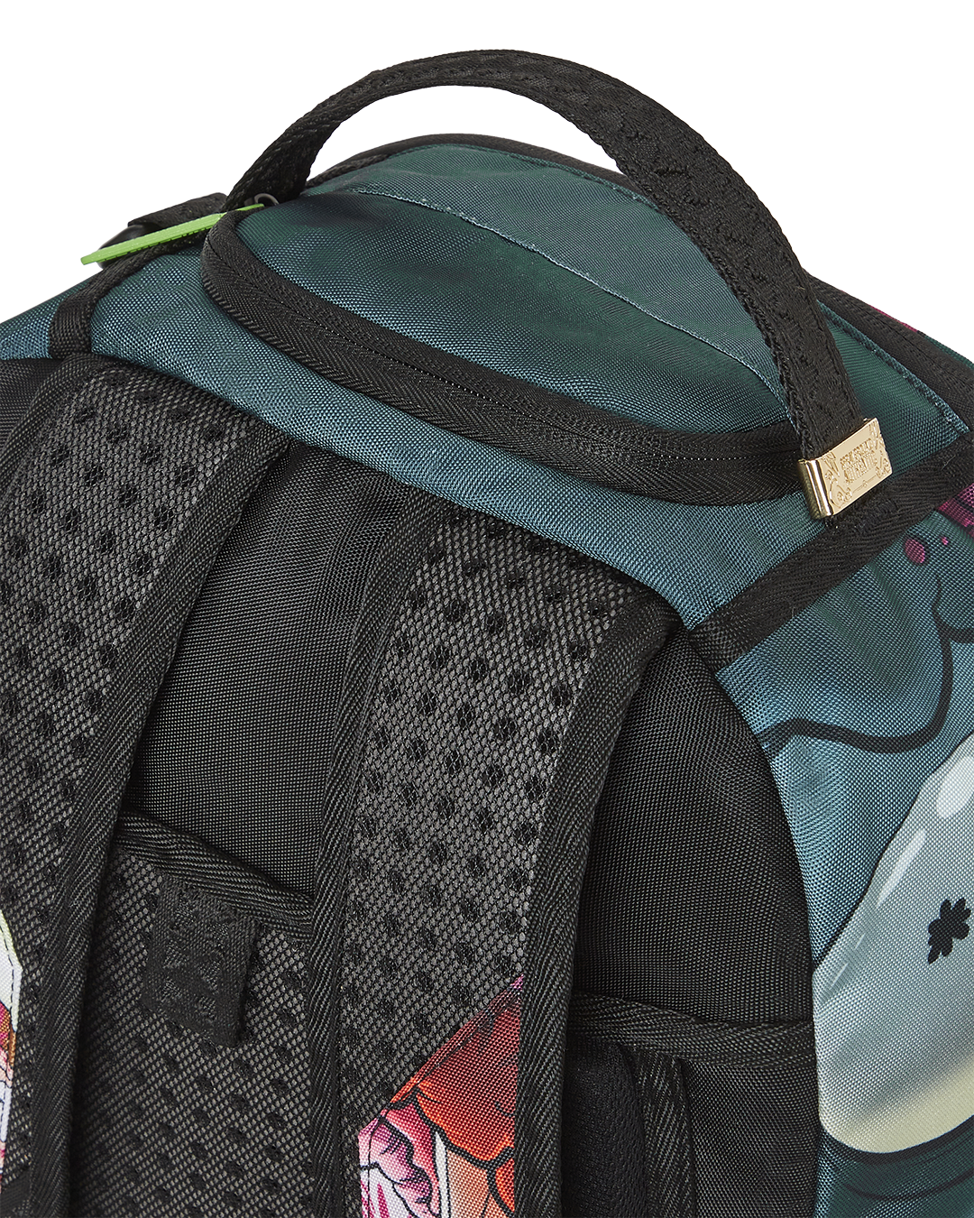 Dimensions: 18″ x 6″ x 11.5″ • Front zipper pocket • Side pockets • Zippered Stash pocket • Separate velour sunglass compartment • Ergonomic mesh back padding • Adjustable Straps for custom sizing • Green zippers with metal hardware • Metal “Sprayground Authentic” badge • Slide through back sleeve connects to carry on luggage to free your hands