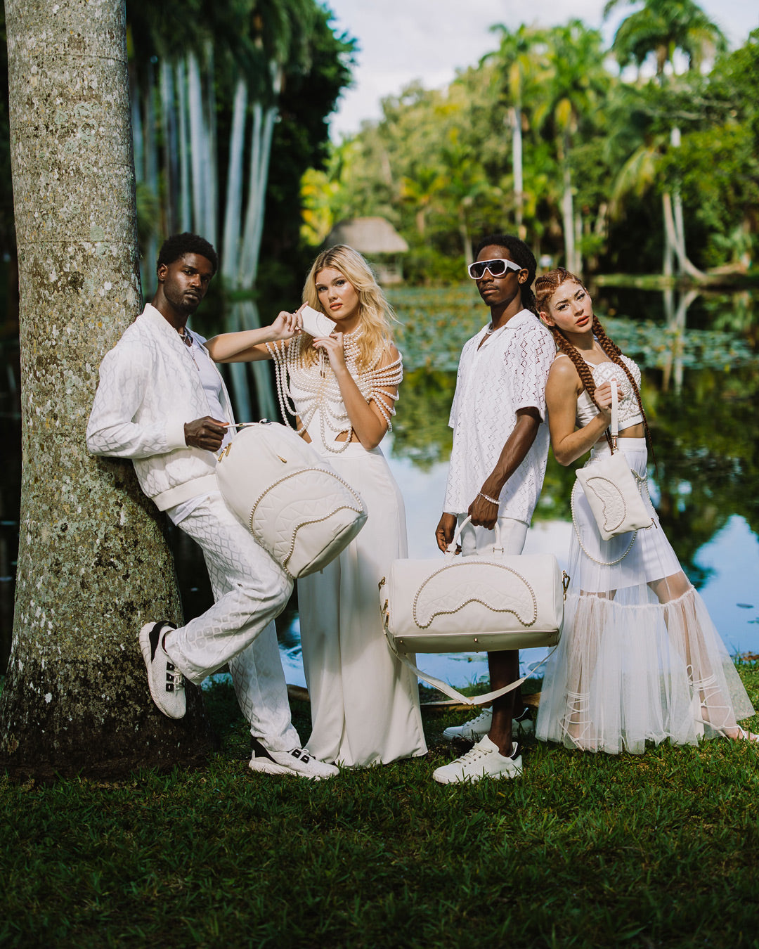 100% PVC embossed sharkmouth embellished with faux pearls featuring gold hardware