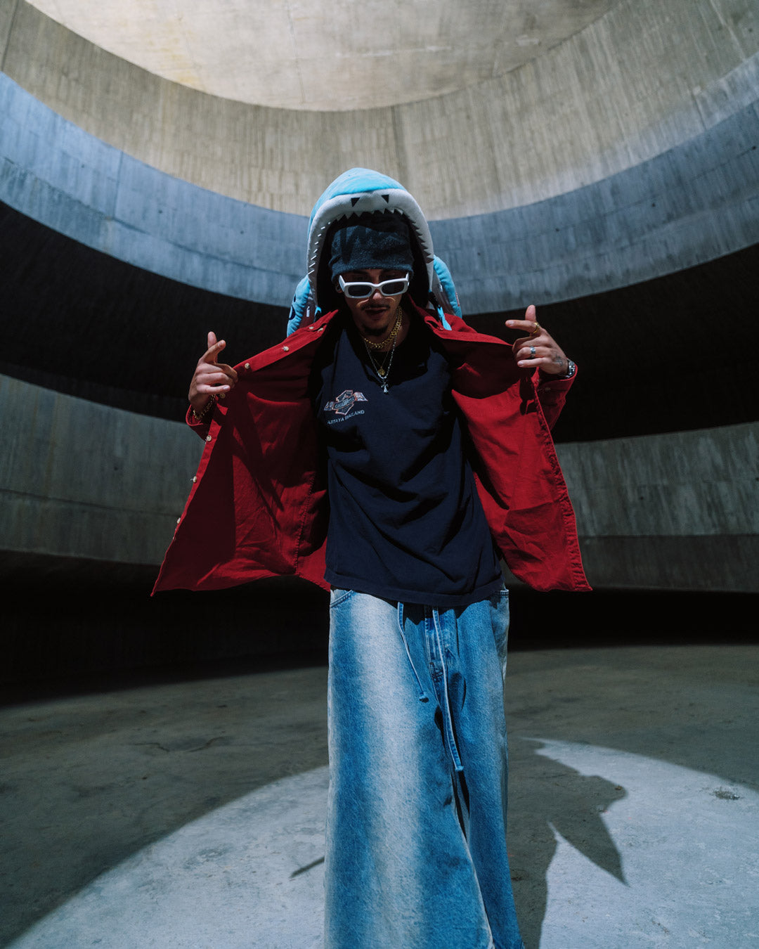 Features a cut and sew drippy sharkmouth