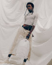 Cut and sew sharkmouth shape with embossed silver foil lettering.