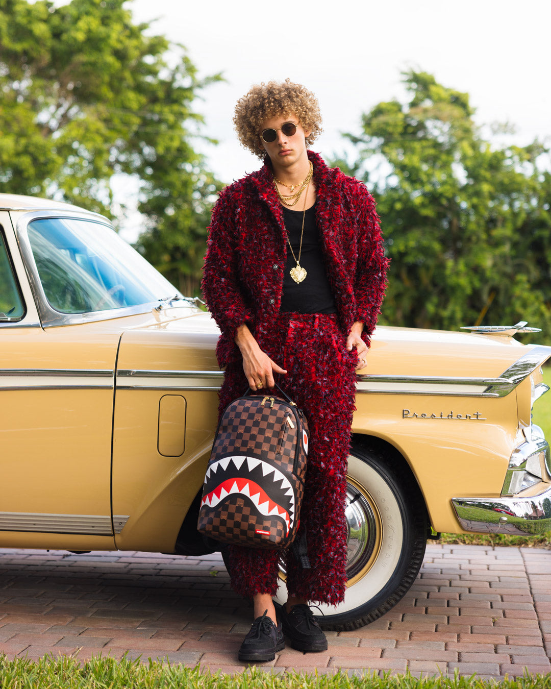 Dimensions: 18″ x 6″ x 11.5″ • Front zipper pocket • Side pockets • Zippered Stash pocket • Separate velour sunglass compartment • Ergonomic mesh back padding • Adjustable Straps for custom sizing • Gold zippers with metal hardware • Metal “Sprayground Authentic” badge • Slide through back sleeve connects to carry-on luggage to free your hands
