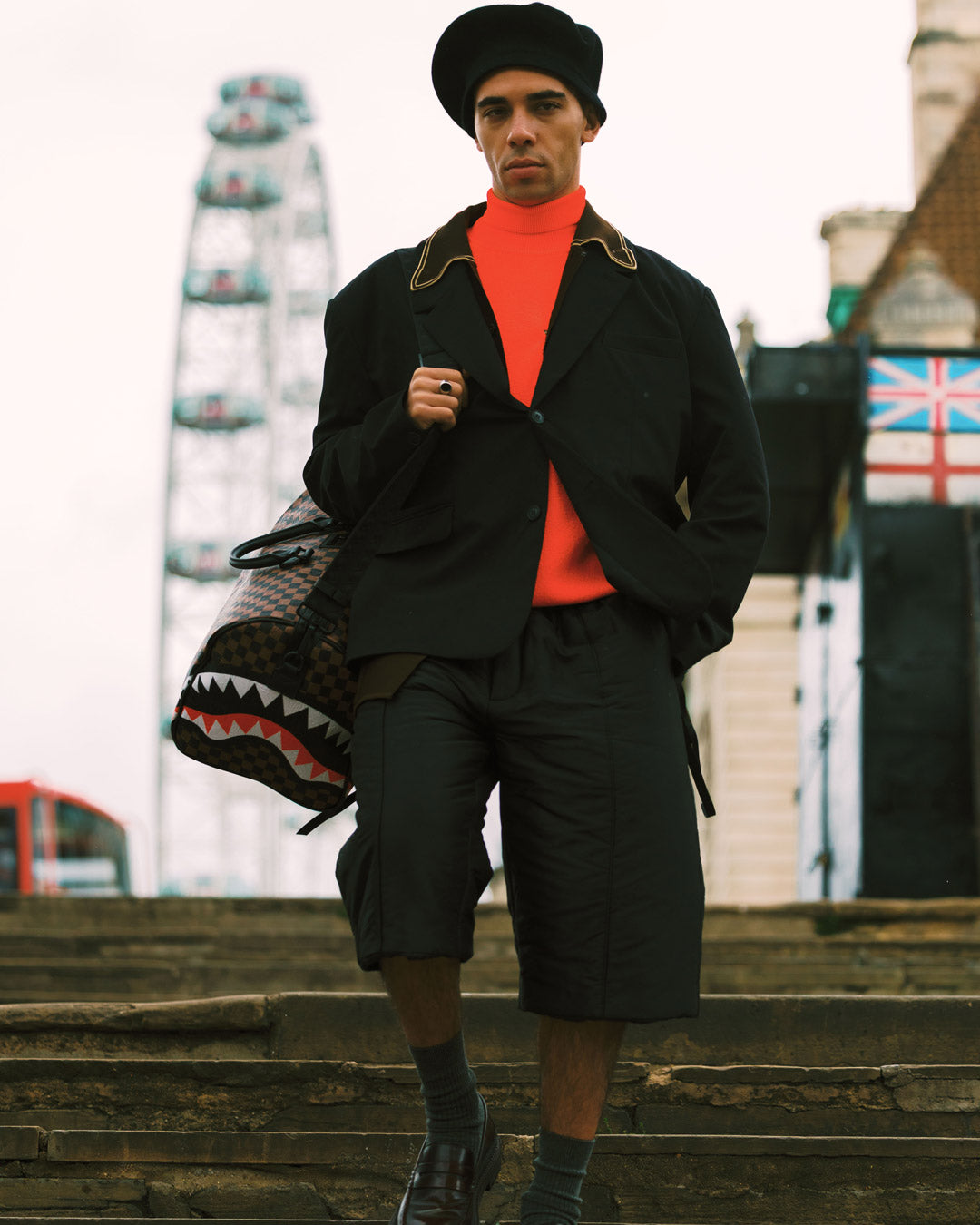 Cut and sew sharkmouth shape with embossed silver foil lettering