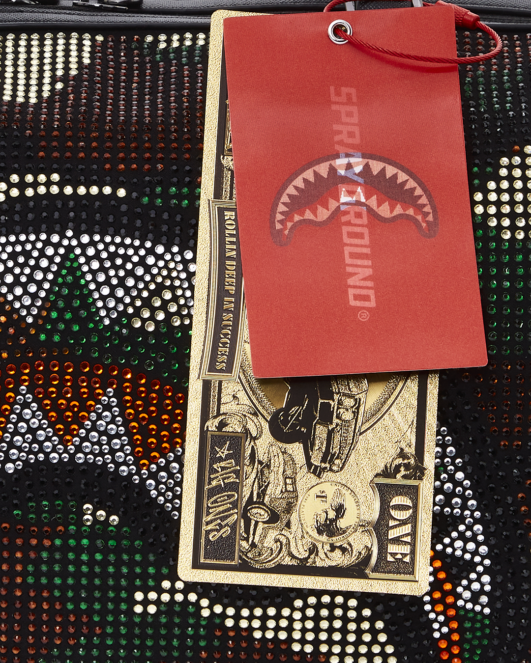 Dimensions: 8″ x 7.5″ x 13″ • Metal zipper pocket• Back Zippers •Zippered sneaker pocket • gold zippers • Adjustable Straps for custom sizing •Metal Zippers with Metal Hardware • bag of Sprayground money